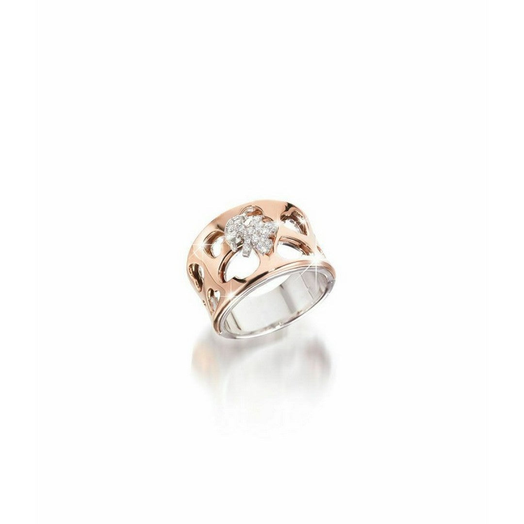 Anello Collezione I Divini di Le Bebè realizzato da una fascia rastremata con gambo in oro rosa 18kt, una fascia a vista in oro bianco 18kt e cuori traforati bimba in oro rosa impreziosita da pavé di brillanti.