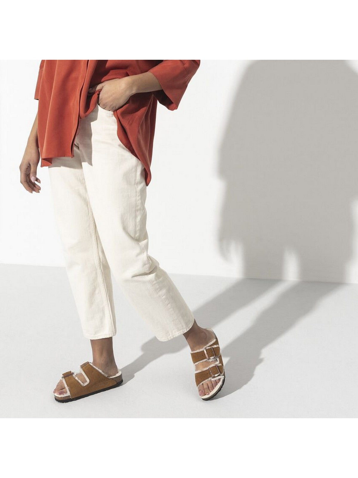Ciabatta BIRKENSTOCK realizzata con pelle scamosciata e fodera in pelliccia di agnello. Plantare anatomico in sughero e lattice