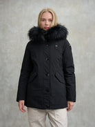 ParkaBLAUER realizzato in neoprene con dettagli in taslan. Capo dalla linea femminile che si può rendere ulteriormente più avvitato grazie alla coulisse in vita.