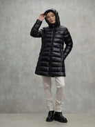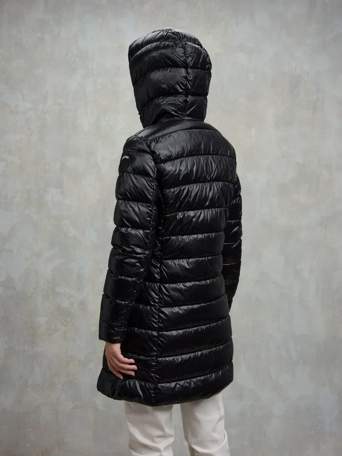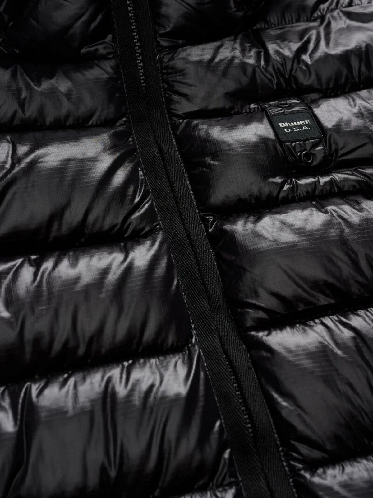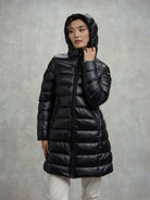 Piumino donna BLAUER lungo in nylon micro rip con cappuccio impunturato a linee orizzontali.