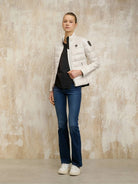 Piumino BLAUER con collo alla coreana e cuciture a righe orizzontali. Imbottitura leggera in morbida piuma e taglio svasato per risaltare la figura.