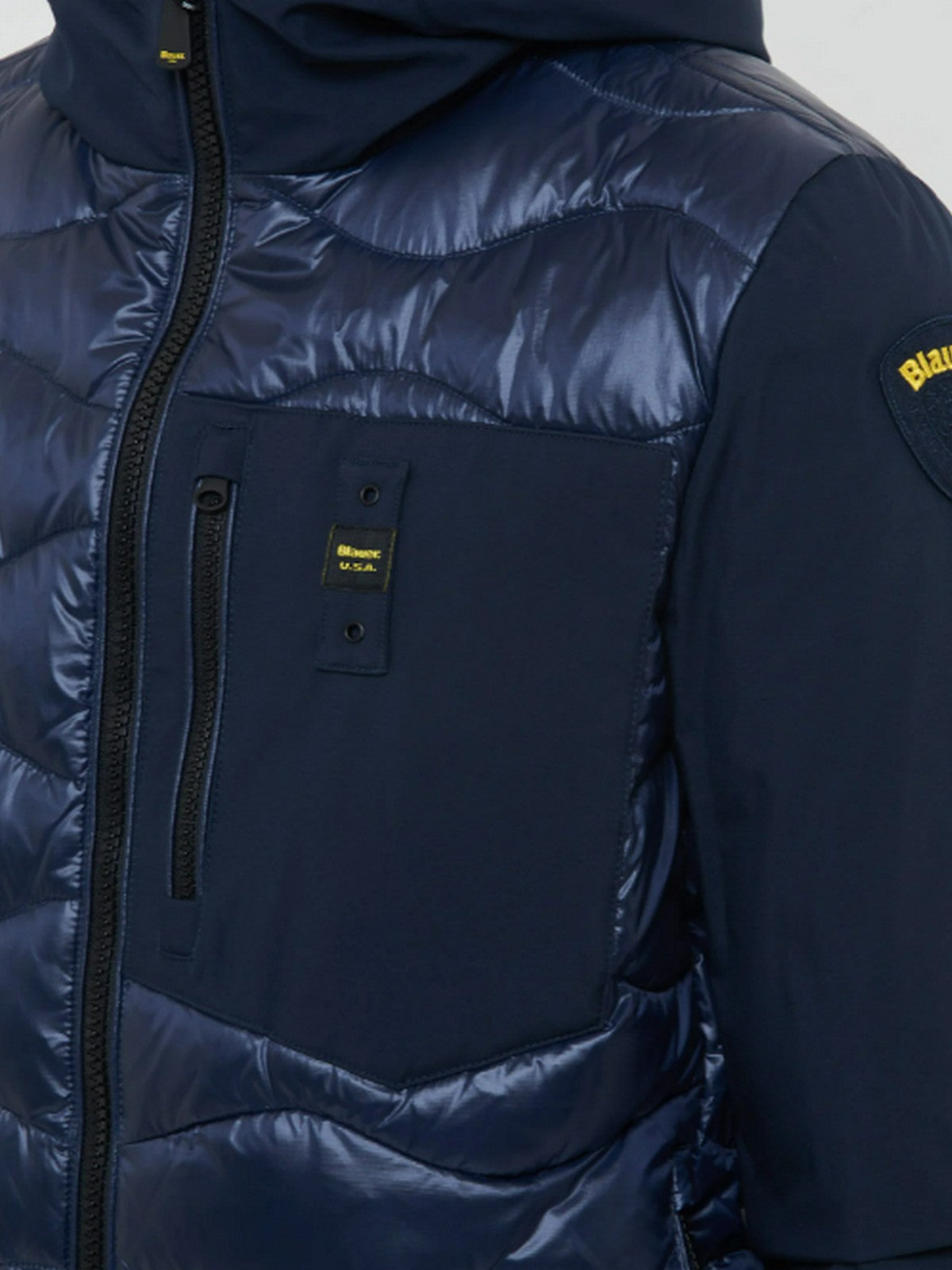 Piumino BLAUER monocromatico in neoprene leggero e liscio sulle maniche e in nylon lucido impunturato ad onde sul corpo. Imbottitura mista per avere caldo anche in condizioni meteo avverse.