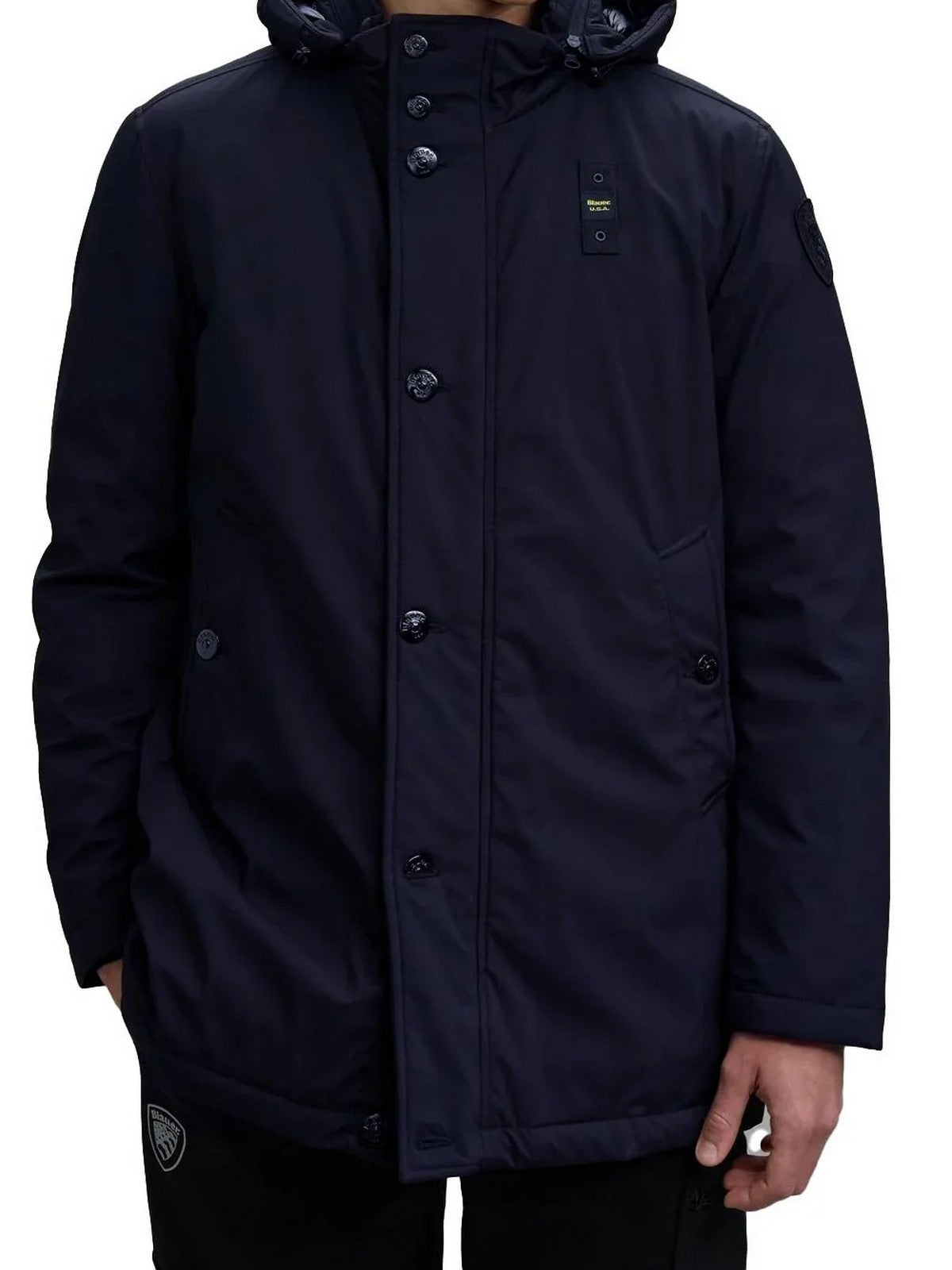 Parka lungo BLAUER in neoprene liscio idrorepellente con collo alto removibile tramite zip. Imbottitura naturale calda ma non ingombrante. Capo iconico Blauer ad inspirazione militare.