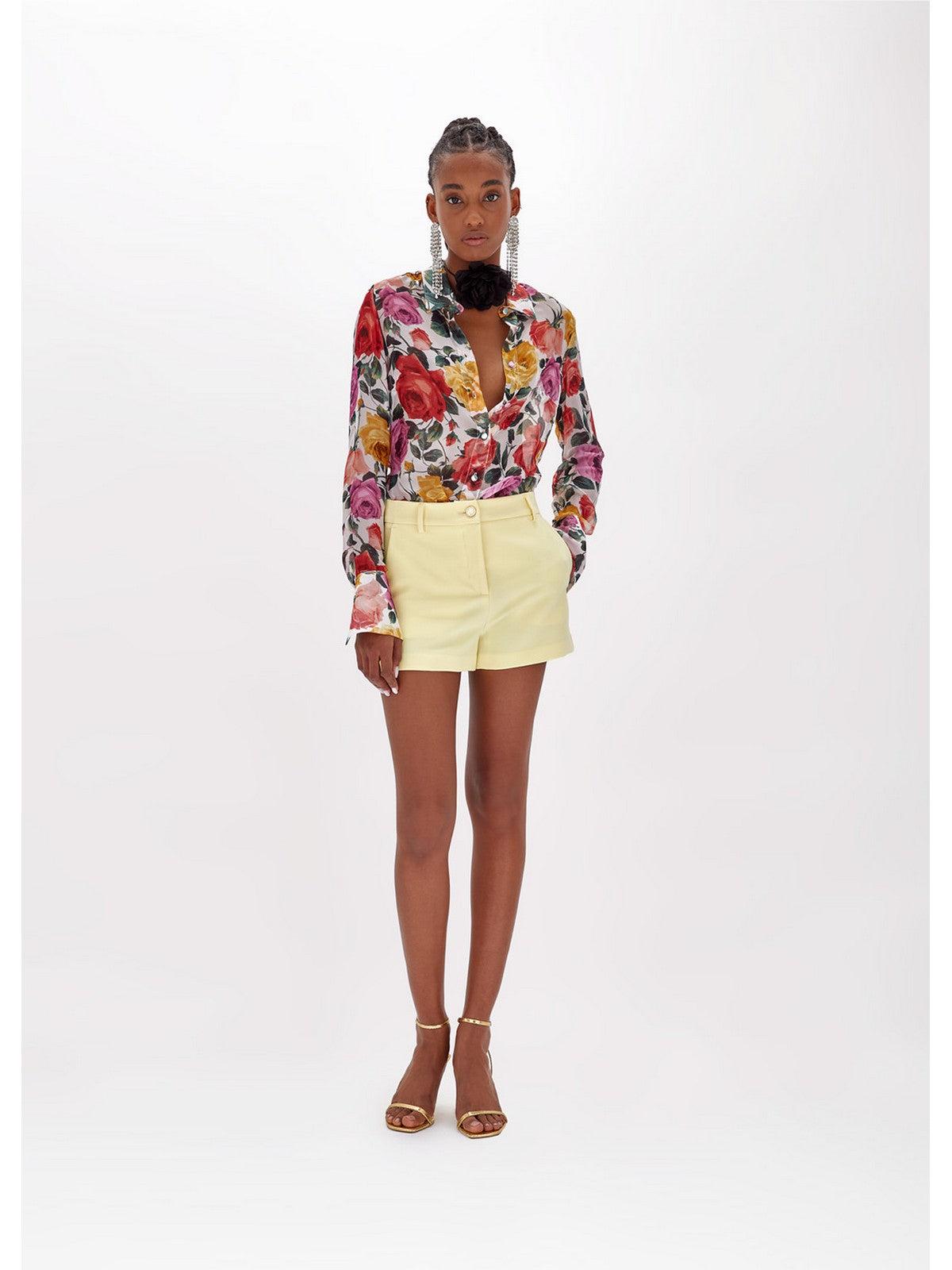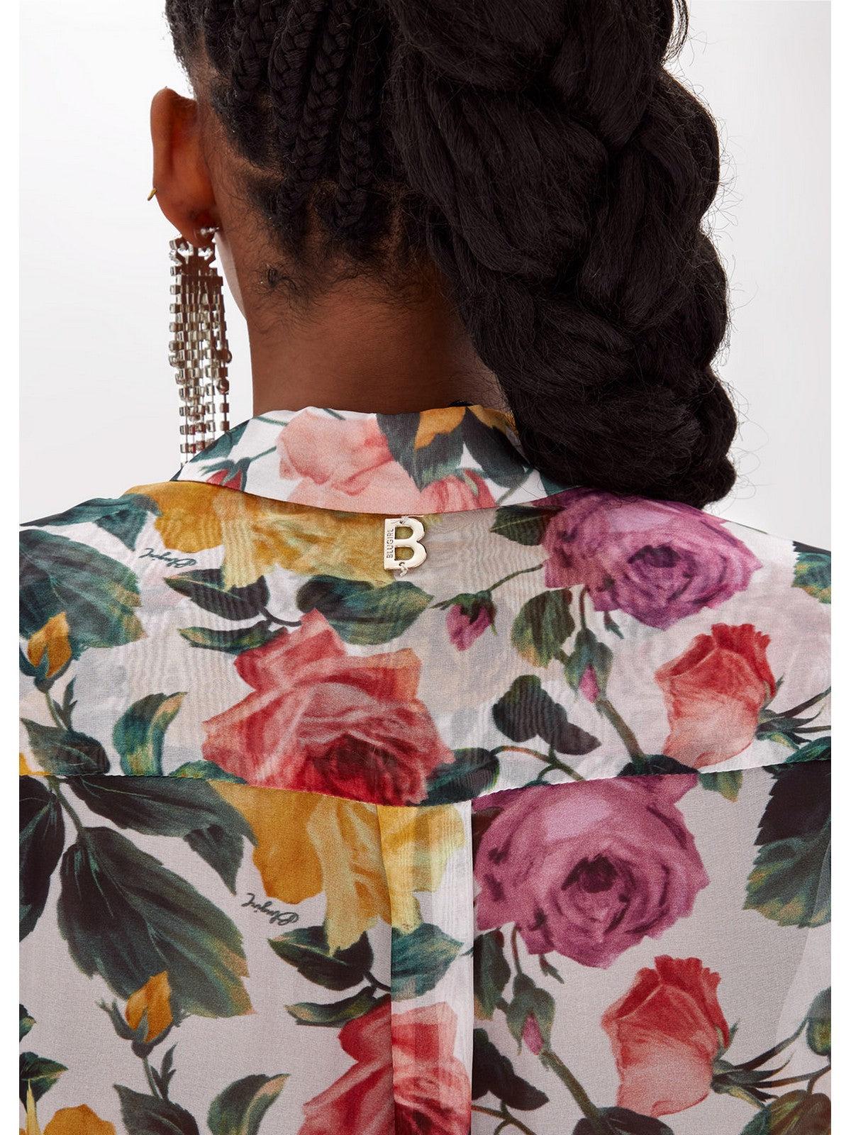 Camicia BLUGIRL in voile di viscosa e seta, motivo floreale. Colletto classico e maniche lunghe con polsini alti, Chiusura con bottoni ricoperti. Fondo arrotondato. Linea regular.