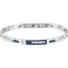 Gioiello da Uomo MASERATI della collezione DIAMONDS realizzato in acciaio inossidabile 316L con inserti in PVD blue - Il bracciale è valorizzato da una targhetta centrale con un contorno in acciaio PVD blue impreziosita da tre luminosi diamanti bianchi naturali per una caratura complessiva di 0,0135 ct - Caratteristico logo a tridente del brand in PVD rose gold - Chiusura con gancio a scatto - Lunghezza regolabile da 18 a 21,5 cm - Garanzia Internazionale: 24 Mesi