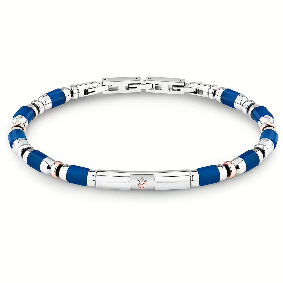 Bracciale da uomo di Maserati della collezione Iconic. Gioiello in acciaio di colore argento/oro rosa. Chiusura a incastro. Pietra di colore blu. Misura gioiello: 19|3cm. La referenza è JM334AVD45