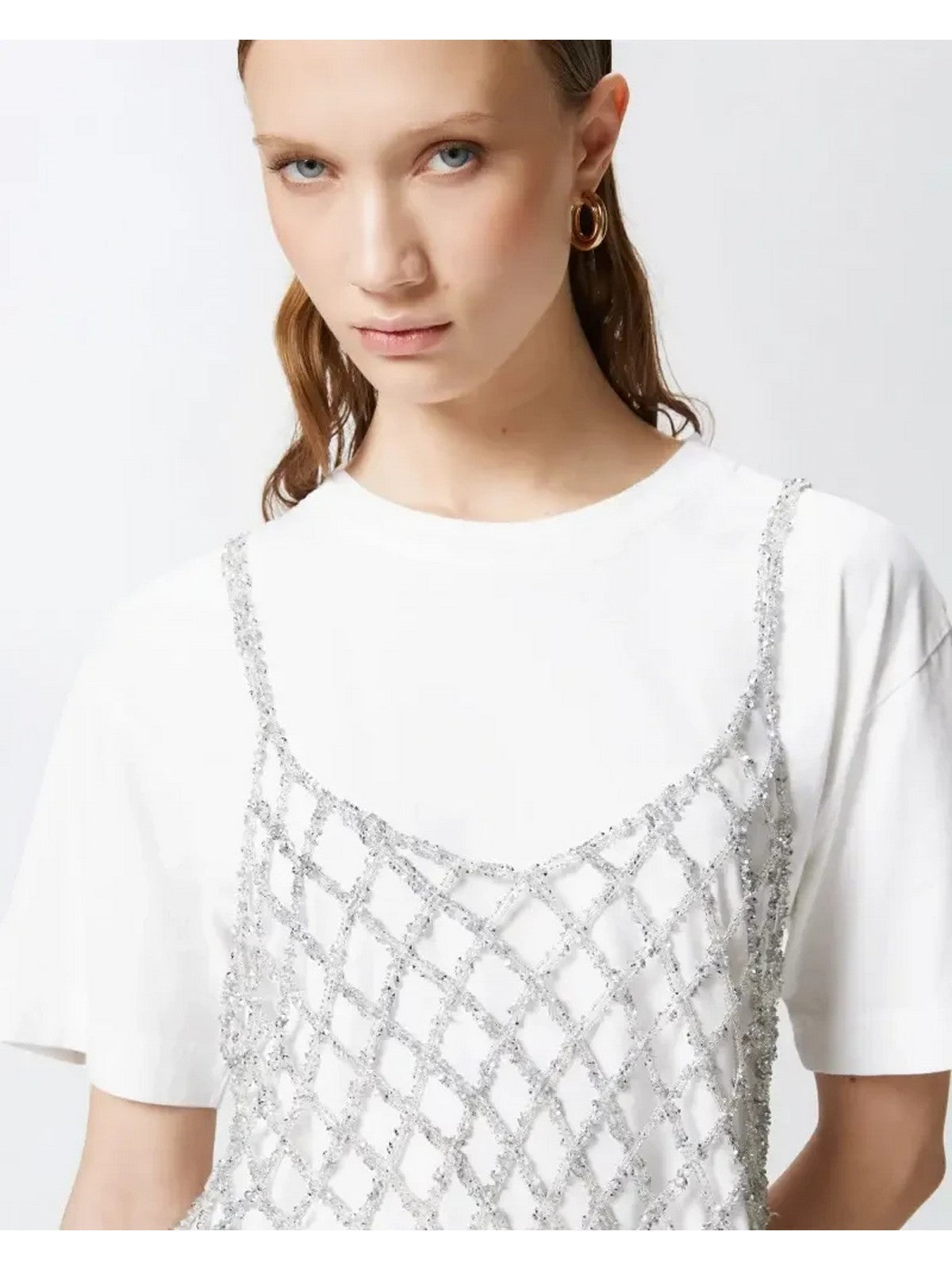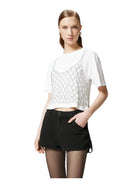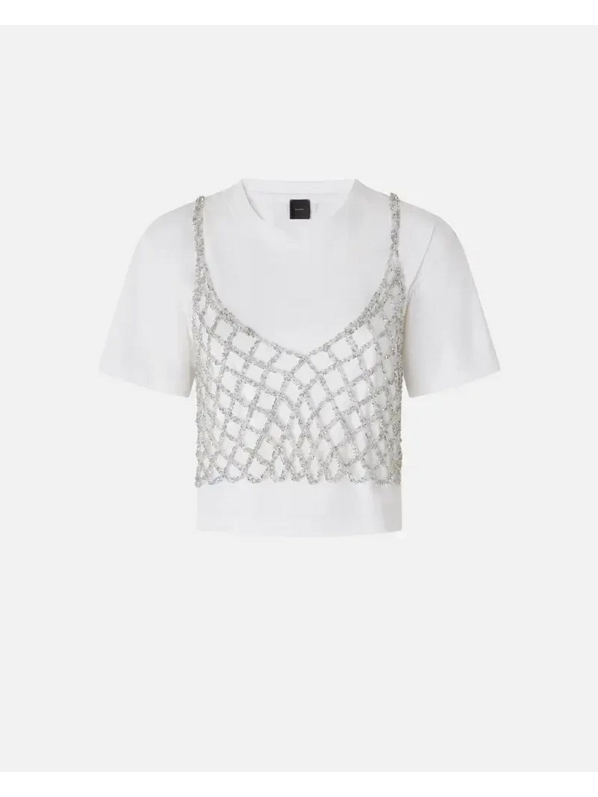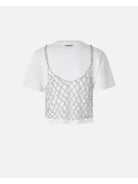 Maglietta a maniche corte in cotone dal taglio corto completata da top a canotta da indossare sopra realizzato in rete crochet metallizzata, che aggiunge un tocco scintillante grazie al particolare filo utilizzato, che include delle piccole paillettes. Questa t-shirt si abbina con facilità ai tuoi pantaloni preferiti, elevando il tuo look in modo semplice, elegante e originale.