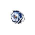 Pandora Viola del Pensiero Blu, argento sterling 925; 2 cristalli arancione scuro, incastonatura a griffe, taglio brillante; 12 micro zircnonia cubica incolore e 44 zirconia cubica incolore, incastonatura a granette, taglio brillante; smalto blu, bianco,