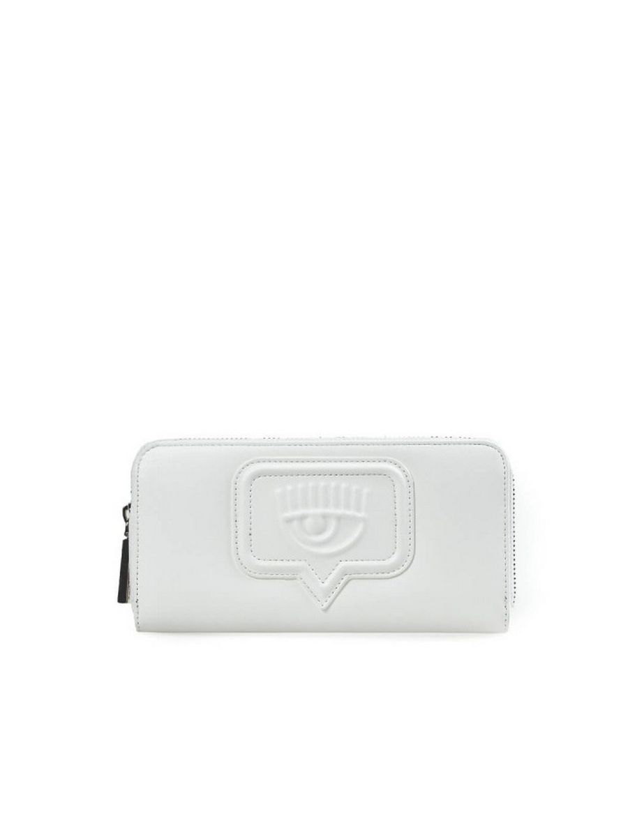 Portafoglio Eyelike realizzato in eco pelle bianca con logo goffrato sul davanti. Interno dotato di scomparti multipli per carte, banconote e tasca portamonete con zip. Dettagli in metallo dorato, Misure 20x10x2,5cm