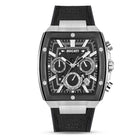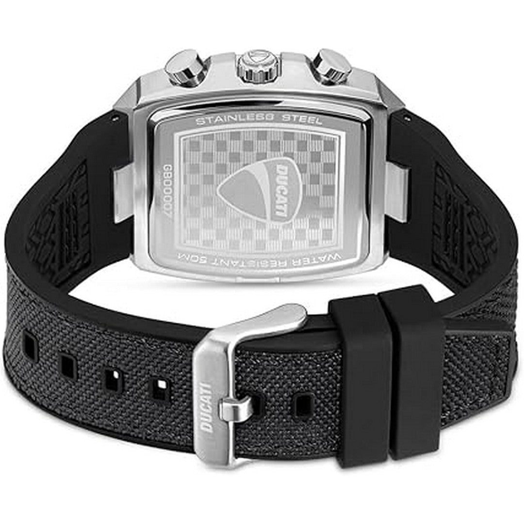 Questo modello è parte della linea DT005 in cui il design del quadrante richiama le strutture dei motori per un maggiore carattere sportivo. Movimento al quarzo cronografo, misure cassa 40x47mm in acciaio, cinturino in tessuto nero