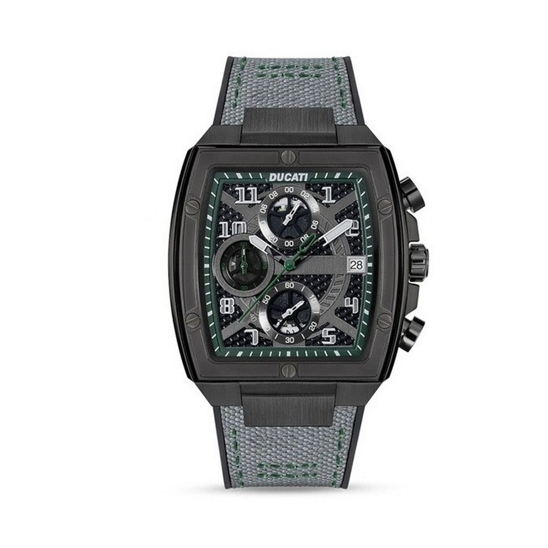 Cinturino in tessuto grigio e silicone nero con fibbia ed ardiglione, quadrante nero scheletratro con logo Ducati e dettagli verdi , resistente all'acqua 5 Atm.
