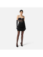 Mini abito ELISABETTA FRANCHI in tulle dalla vestibilità aderente. Il vestito ha spalline, coppe, cintura con logo. Si distingue per i sensuali giochi di semi-trasparenza donati dalla costruzione a bustier, definita da dettagli in vinile. Protagonista è la gonna a doppia balza con frange, a regalare movimenti ipnotici.