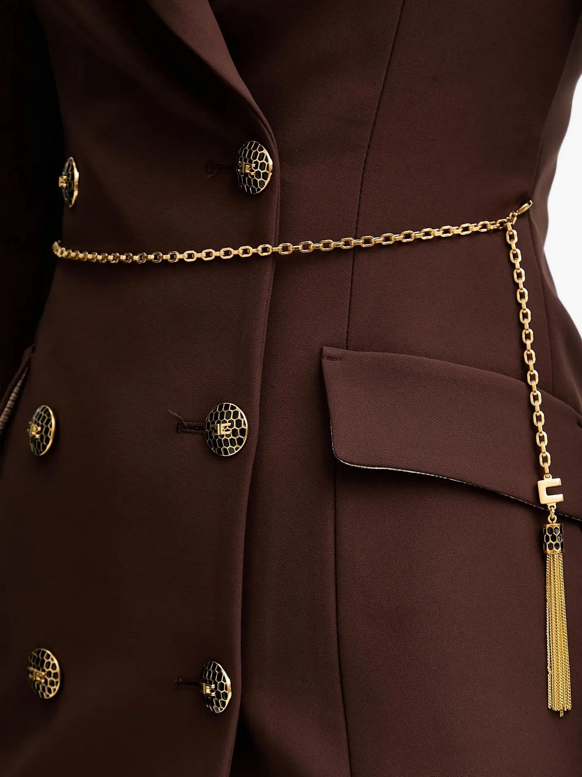 ? Bottoni e cintura in catena con logo e nappina in trama snake.