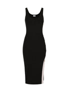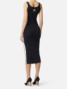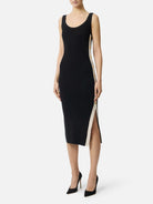 Abito ELISABETTA FRANCHI in maglia, lavorazione jacquard applicata al logo sullo spacco laterale.