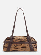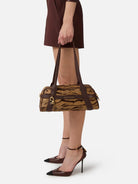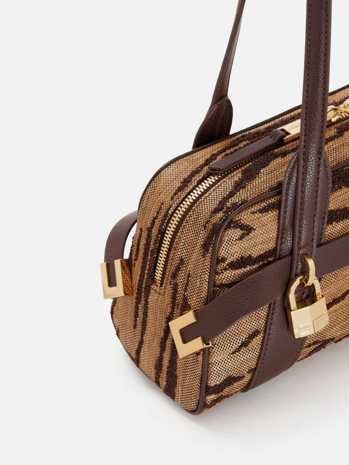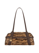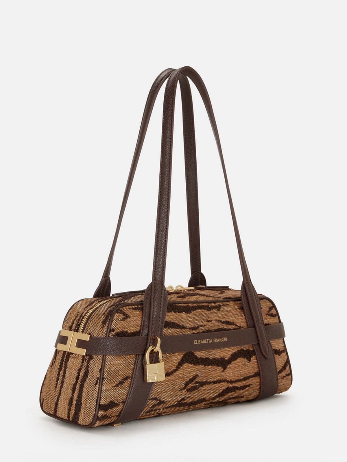 Borsa bauletto ELISABETTA FRANCHI realizzata in tessuto con texture effetto rafia, stampa all-over a tema tigre, ispirata a colori e forme naturali.