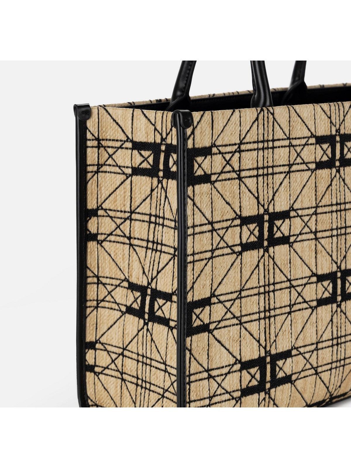 Shopper grande ELISABETTA FRANCHI in tessuto jacquard e dettagli in tessuto effetto pelle. Due manici e tracolla di servizio per portabilità a spalla. Chiusura con pattina interna e bottone. Fodera in tessuto.