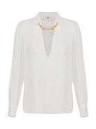 Camicia ELISABETTA FRANCHI in georgette di viscosa dalla vestibilità slim. Ha colletto a camicia con scollo a V e maniche lunghe con polsi alti. Impreziosita dall'accessorio gioiello con logo ed elementi tubolari in metallo dorato, amovibile per sperimentare più opzioni di styling.