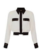 Camicia cropped ELISABETTA FRANCHI in georgette dalla vestibilità slim. Ha colletto classico e maniche lunghe. Gli elementi a contrasto creano un dinamico motivo bi-color. Note di luce coi bottoni in metallo dorato.