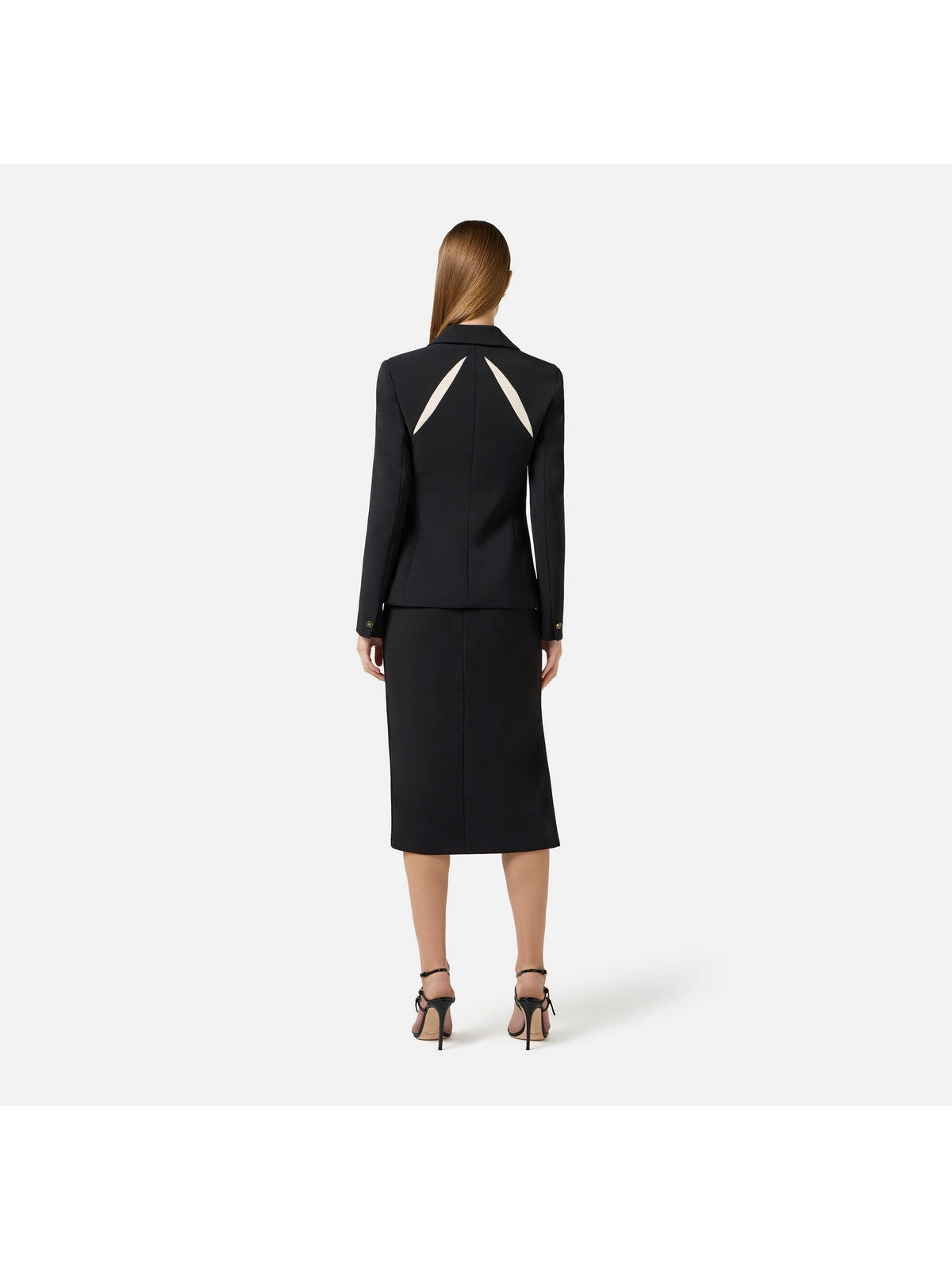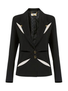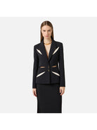 Giacca Elisabetta Franchi in crêpe leggero con cut-out bicolore a ricreare un intarsio geometrico di ispirazione floreale sul davanti e ripetuti sul retro.