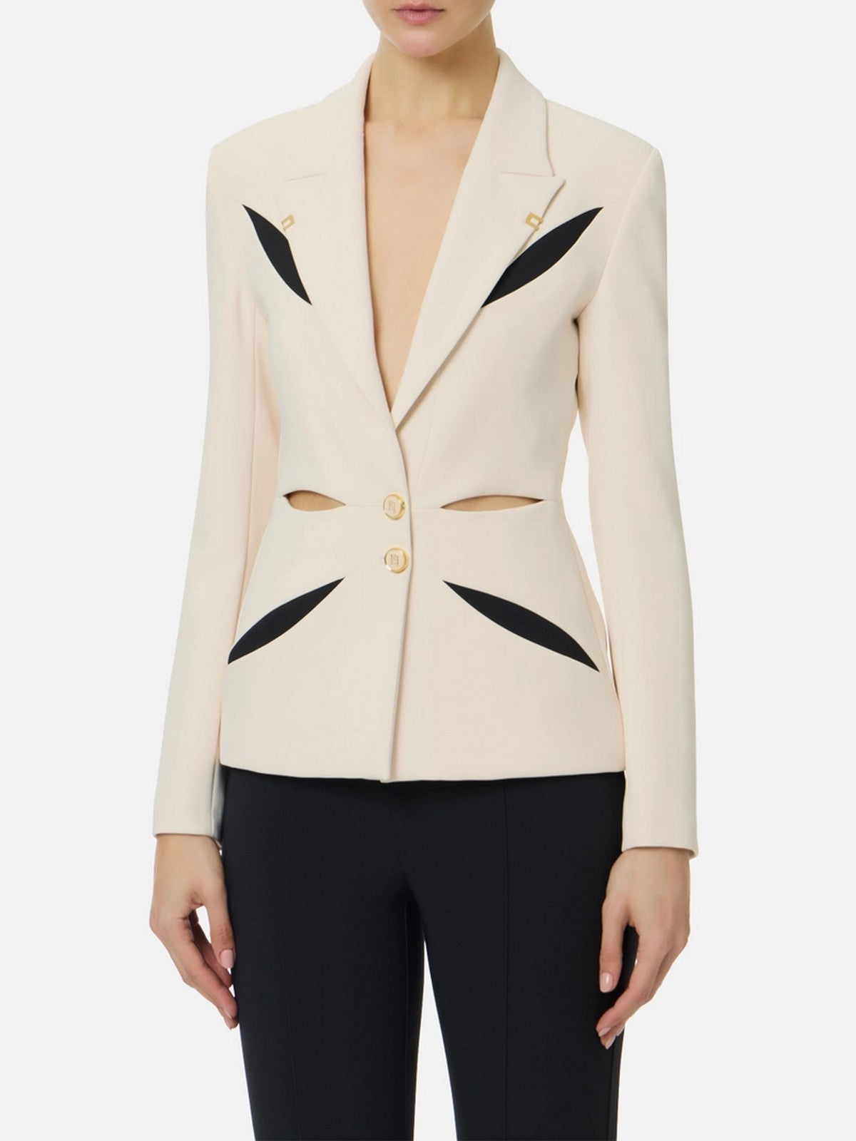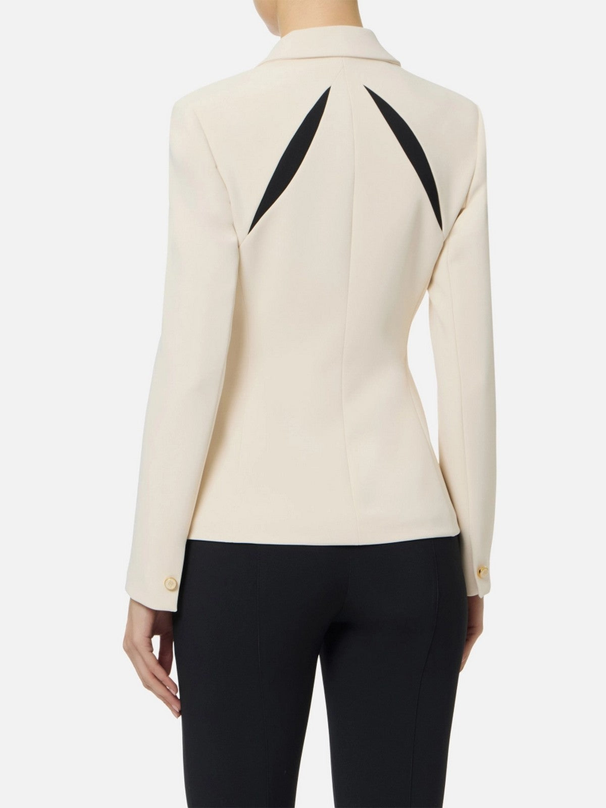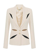 Giacca Elisabetta Franchi in crêpe leggero con cut-out bicolore a ricreare un intarsio geometrico di ispirazione floreale sul davanti e ripetuti sul retro.