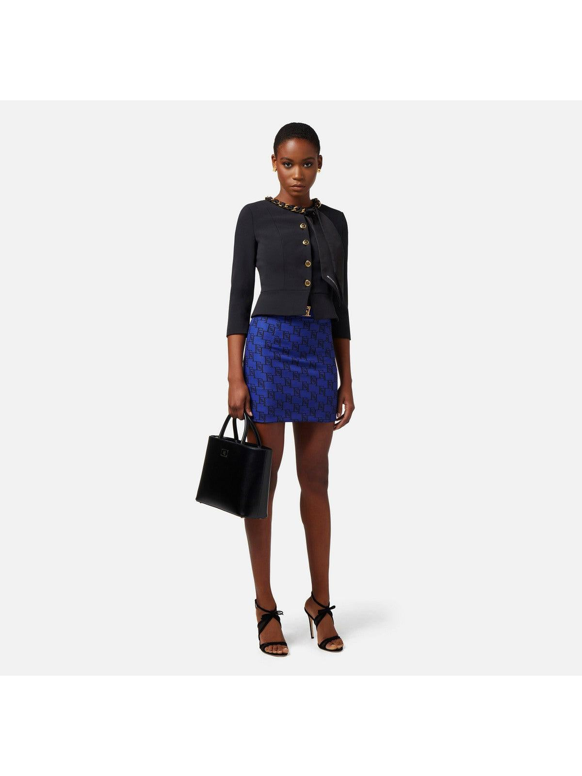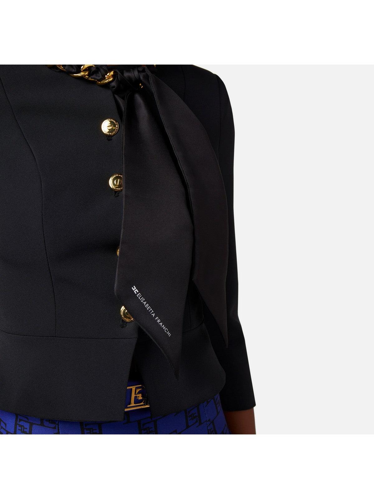 Giacca ELISABETTA FRANCHI in doppio crêpe stretch. Chiusura a monopetto con bottoni in metallo dorati. Scollo a giro impreziosito da accessorio in catena e foulard infilato e maniche a 3/4.