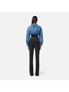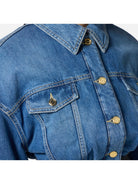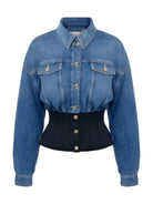Bomber ELISABETTA FRANCHI in denim con fascia in neoprene con stecche interne che definiscono la costruzione a bustier.