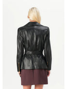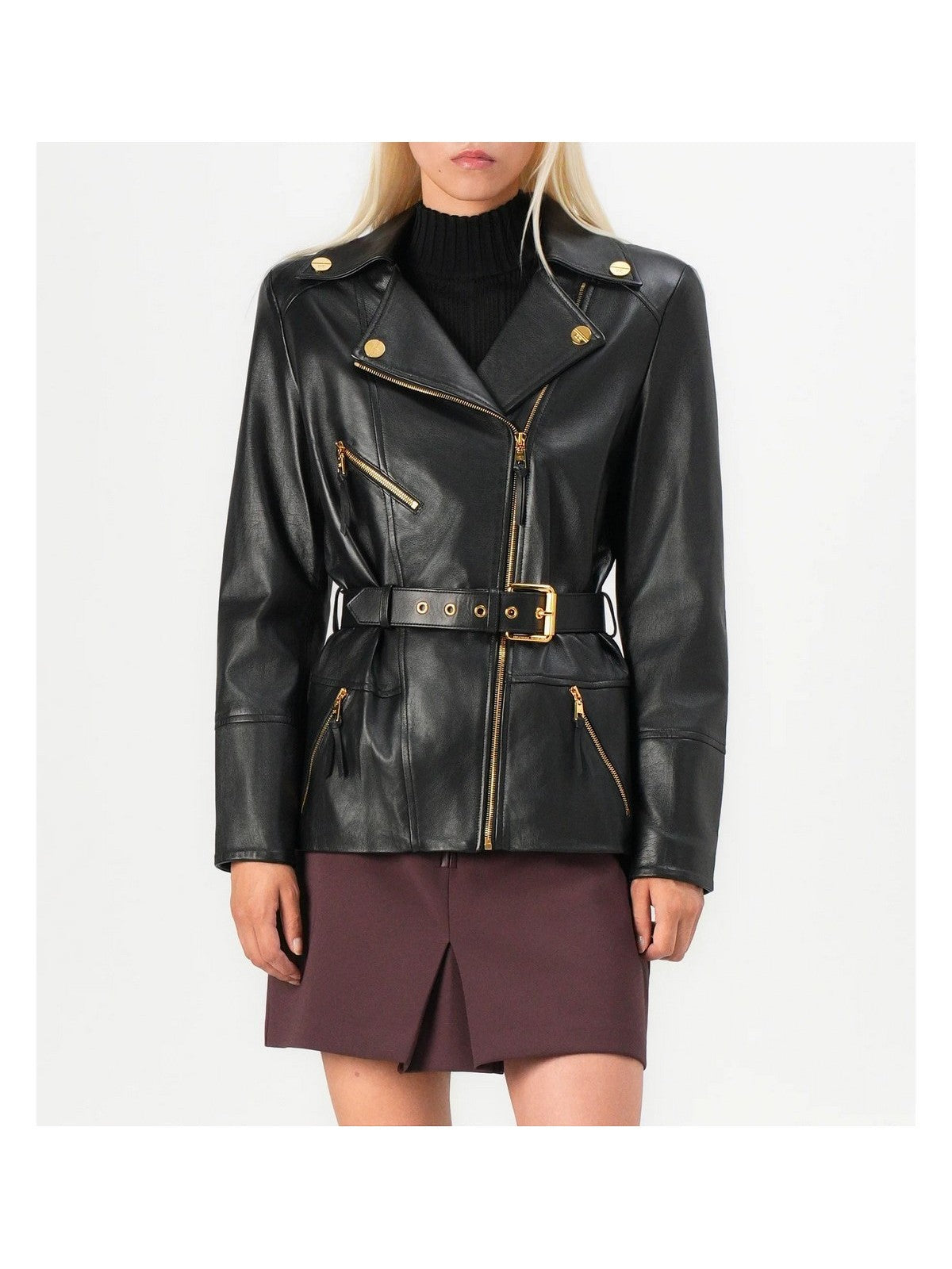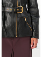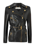 Chiodo in pelle ELISABETTA FRANCHI modello biker con rever, tasche e chiusura asimmetrica con zip. Reinterpretata per l'eleganza contemporanea con spalle strutturate, cintura con fibbia che esalta il punto vita e passante con logo sul retro a creare un effetto di arricciatura.