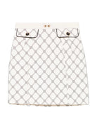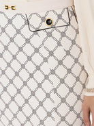 Questa minigonna è pensata per valorizzare la silhouette con eleganza moderna. Il design è impreziosito da un raffinato morsetto gioiello con logo smaltato, posizionato strategicamente sul fascione per un tocco distintivo. I dettagli di piping a contrasto aggiungono definizione al capo, mentre i bottoni con ghiera in metallo dorato richiamano uno stile sofisticato e senza tempo. Una scelta ideale per chi cerca un equilibrio perfetto tra classe e femminilità.