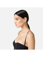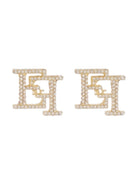 Orecchini ELISABETTA FRANCHI in metallo con finitura dorata, impreziositi dal pavé di strass e con doppio logo centrale. Chiusura con ago.