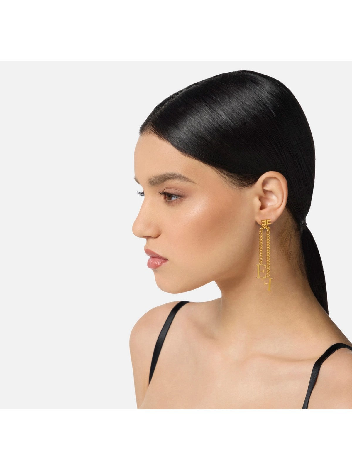 Orecchini in metallo con finitura dorata caratterizzati dal motivo in catena impreziosito dagli charms con logo alle estremità. Chiusura con ago.