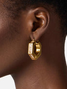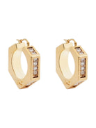 Orecchini ELISABETTA FRANCHI realizzati in metallo con finitura dorata. Dal design ispirato alla forma di un bullone, sono impreziositi da luminose applicazioni di strass e dettagli di logo a rilievo.