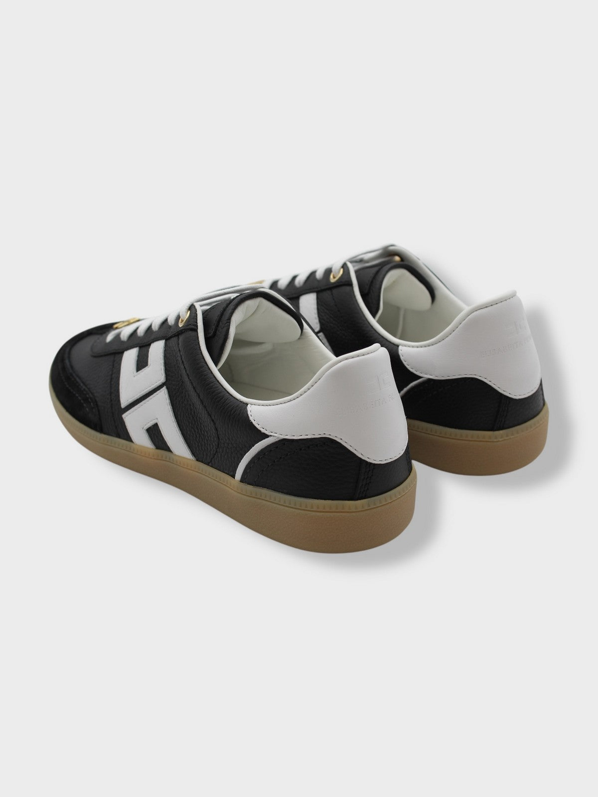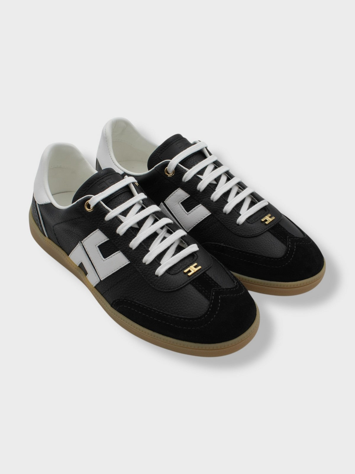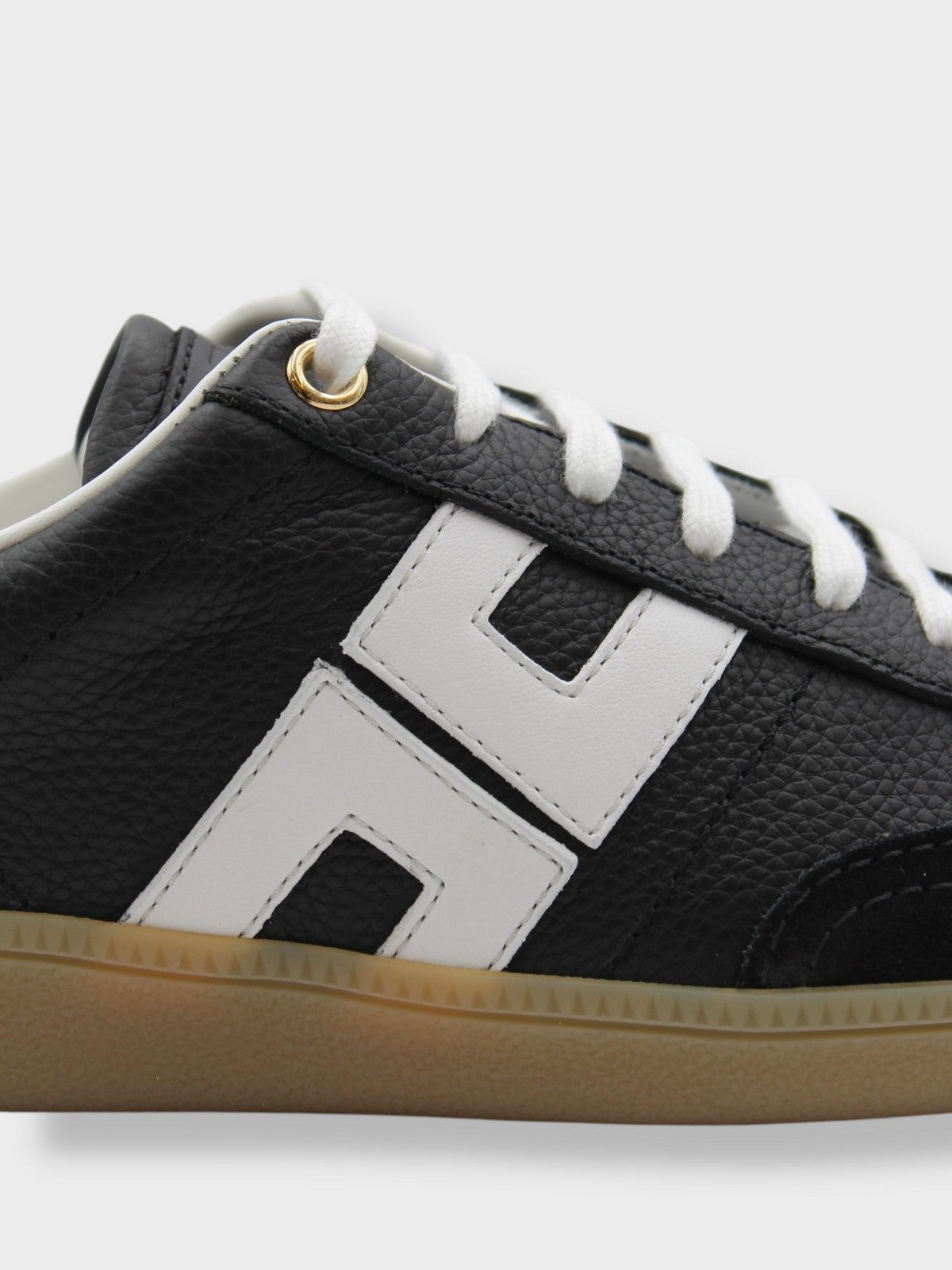 Il punto di forza di questa sneaker è il logo a contrasto, posto strategicamente sulla parte laterale, che dona un tocco di visibilità e audacia senza compromettere la sua eleganza. La scelta del logo, realizzato in un colore più chiaro rispetto alla base nera, crea un effetto visivo interessante e accattivante.