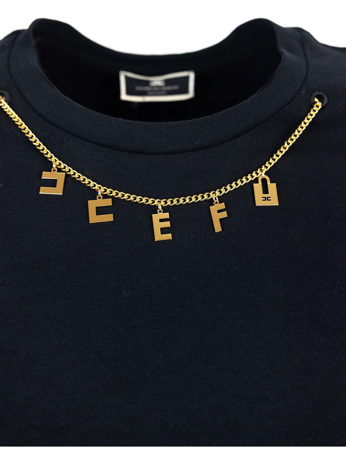 T-shirt ELISABETTA FRANCHI in jersey di cotone leggero impreziosita da un accessorio con charms logo in metallo dorato sotto lo scollo. Collo a giro e maniche corte. Vestibilità over.
