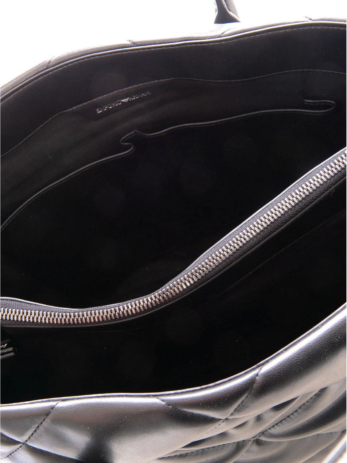 Borsa shopping EMPORIO ARMANI in similpelle trapuntata, tracolla a catena con inserto in pelle, manici rigidi. Tre tasche interne: una con chiusura lampo e due aperte, logo aquila.