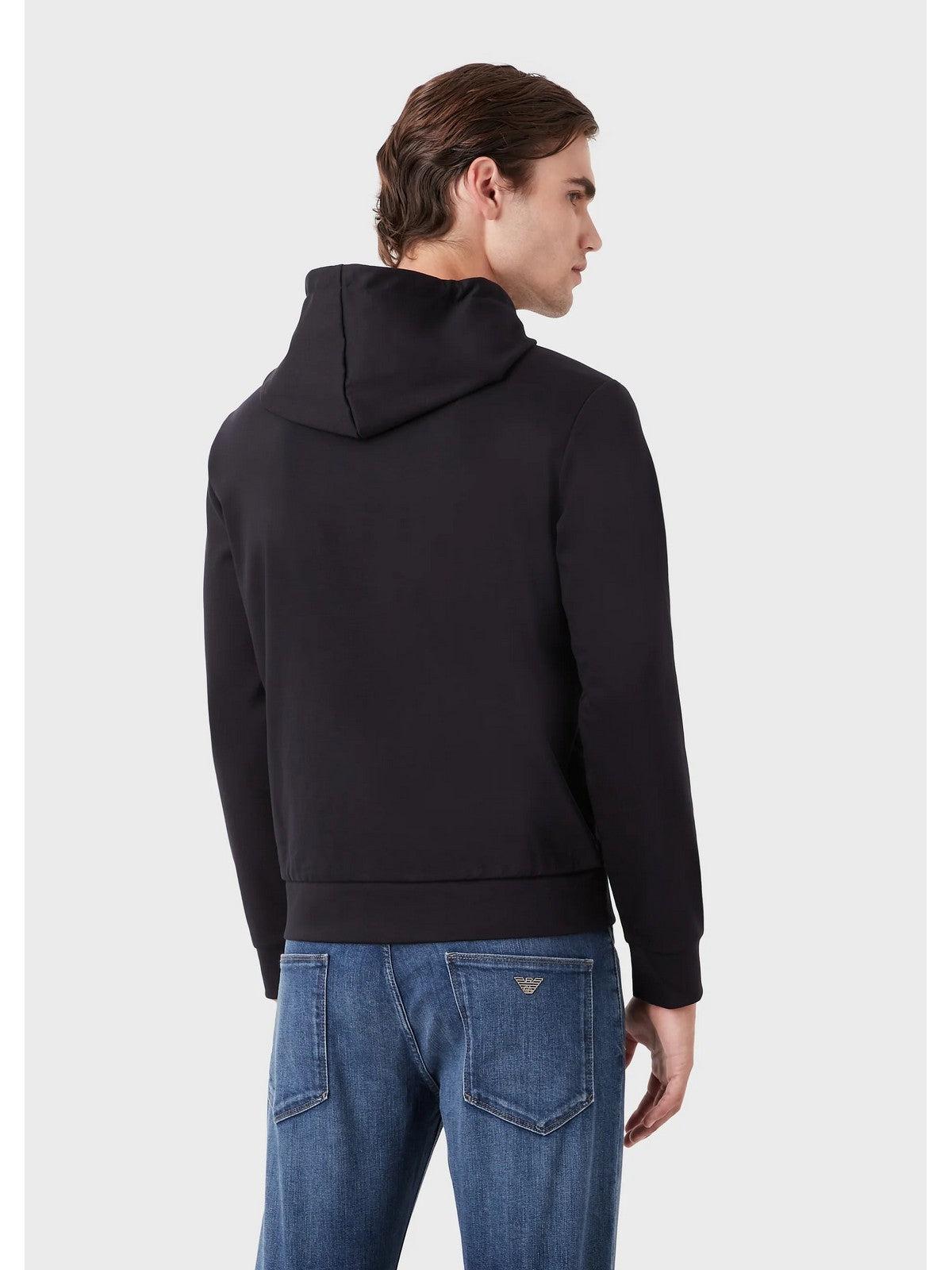 Felpa aperto EMPORIO ARMANI in maglia punto Roma, una trama molto gradevole al tatto con patch logo sul petto. Chiusura con zip. Cappuccio con coulisse, tasche laterali. Collo a giro e maniche lunghe. Rifinito a coste su polsi, fondo.
