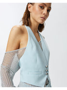 Gilet corto dalla linea sartoriale realizzato in tessuto cady tecnico, particolarmente resistente a pieghe e grinze. Il gilet è caratterizzato da un design estremamente femminile, con scollo all'americana che include allacciatura dietro il collo e schiena scoperta. Chiusura con tre bottoni in metallo davanti. Il gilet diventa protagonista del tuo outfit da cerimonia, sostituendo o accompagnando il blazer nei tuoi completi, aggiungendo un tocco raffinato e di classe alle feste.