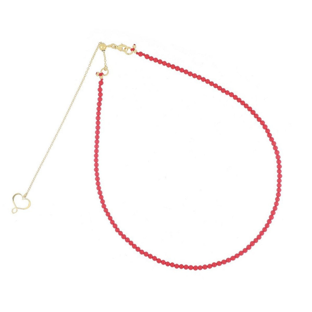 Girocollo chocker in pietre di pasta di corallo di 2,5 mm realizzato con catena in argento 925 placcato in oro giallo ad alto spessore e ad alta resistenza. La misura della collana è regolabile fino ad un massimo di 42 cm grazie alla piccola sfera scorrevole. Chiusura a moschettone.