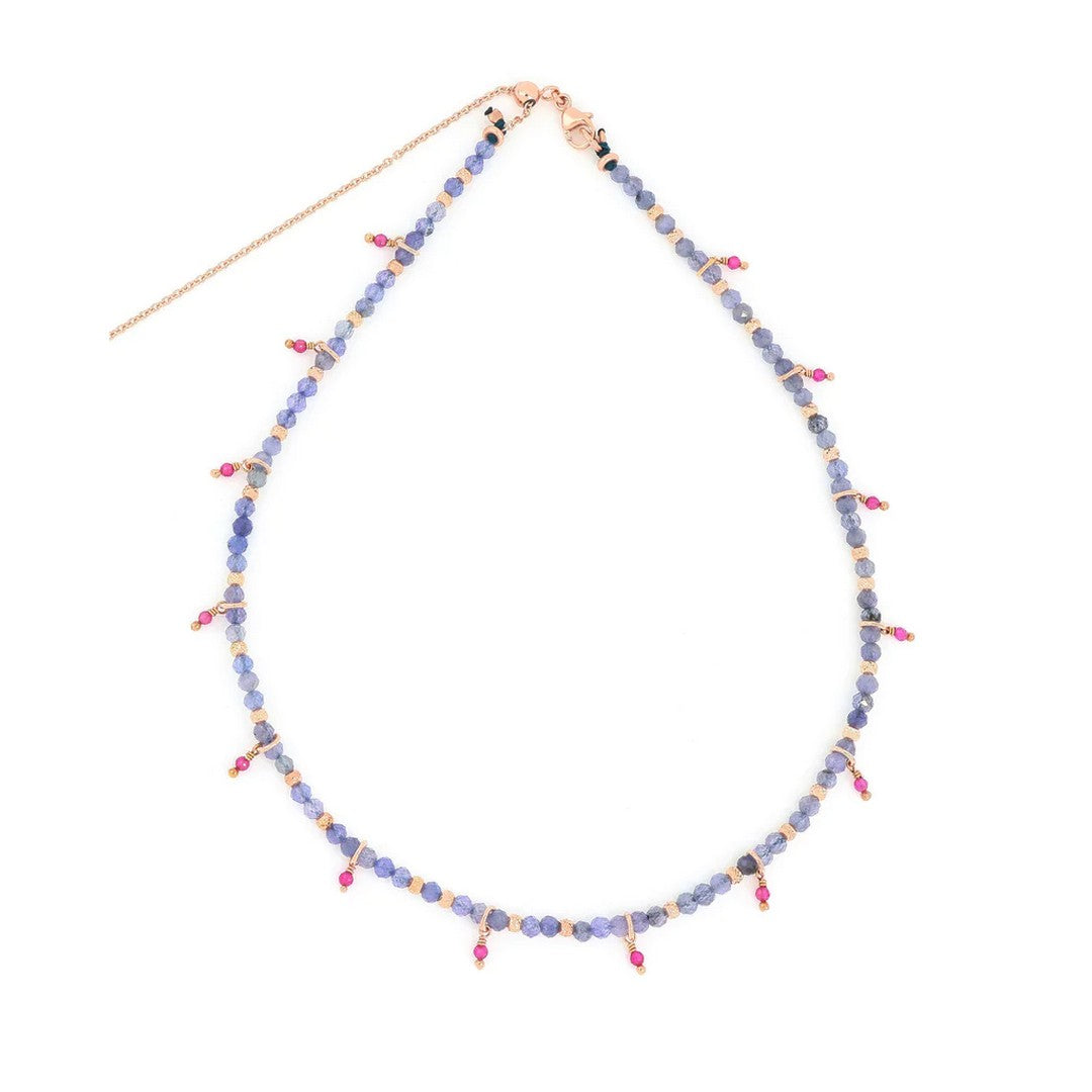 Collana girocollo della collezione Maman et Sophie Acqua e Fuoco da donna. Colore: oro rosa e azzurro. Il gioiello è in argento 925? con galvanica in oro rosa ad alto spessore e resistenza impreziosito da pietre di Tanzanite e gocce di Rubellite rosa pendenti. La dimensione della circonferenza è regolabile da 31 a 42,5 cm grazie alla piccola sfera scorrevole. Può essere indossato come choker. Chiusura a moschettone che termina con il cuore Maman con smaltatura nera.