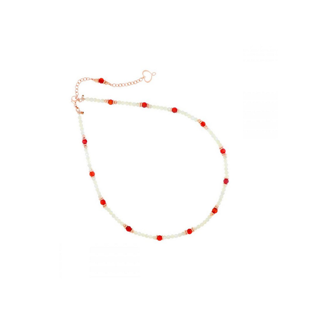 Girocollo in argento 925 con galvanica oro rosa ad alto spessore e ad alta resistenza. Il girocollo è composto da pietre di corniola e madreperla alternate a sfere di 3 mm in argento galvanizzato oro rosa.