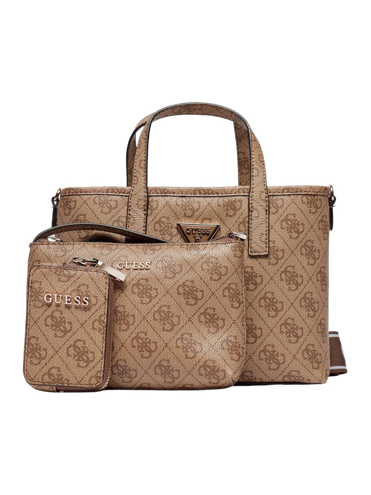 Borsa GUESS in simil pelle. Stampa 4G logo. Triangolo logo in metallo frontale. Pochette interna con cerniera lampo. Tracolla in tessuto logata, removibile. Charm pochette removibile su tracolla. Chiusura con bottone automatico.