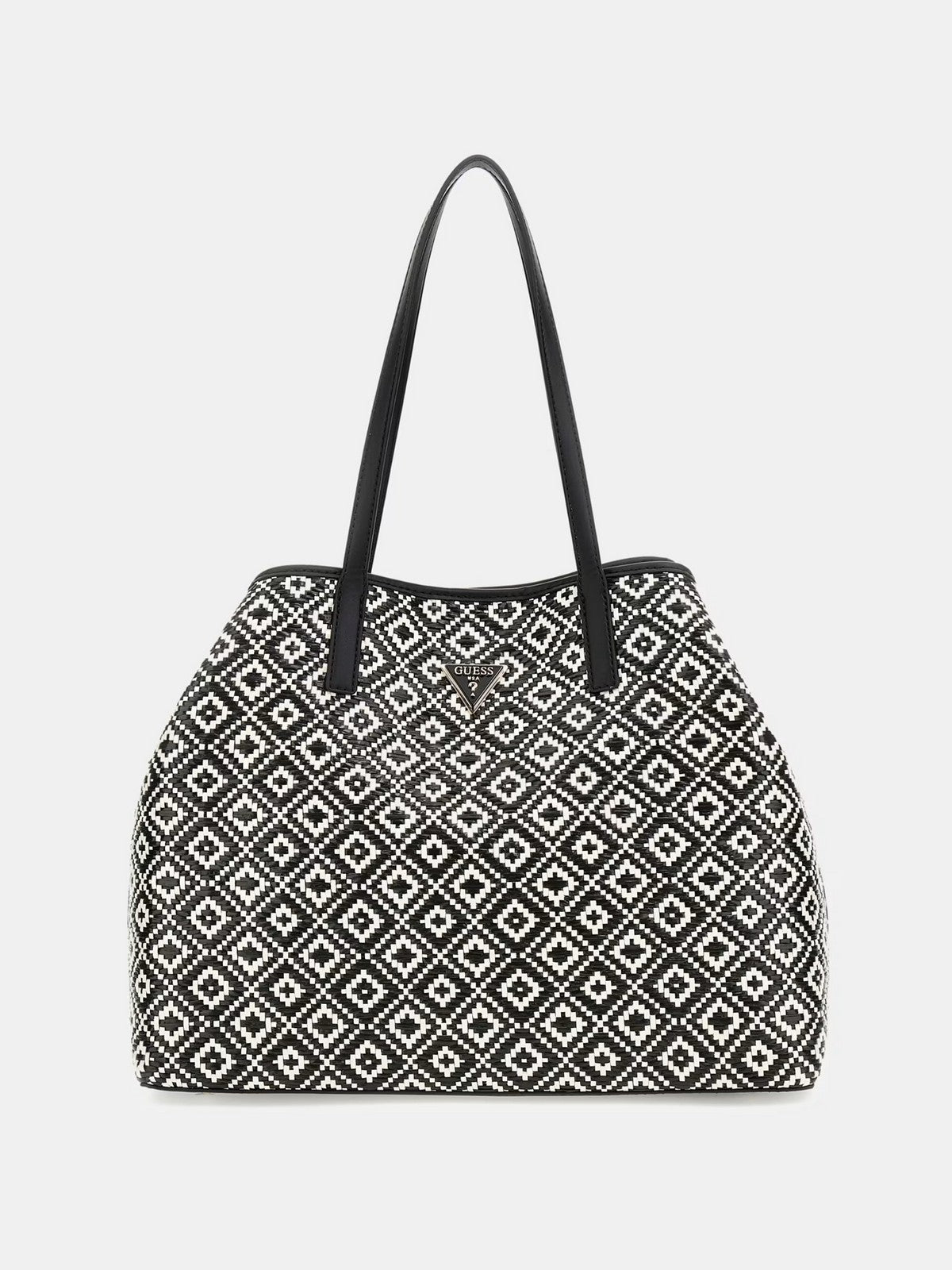 Borsa GUESS realizzata in rafia con Inserti in simil pelle. Lavorazione geometrica. Triangolo logo in metallo frontale. Chiusura con bottone.