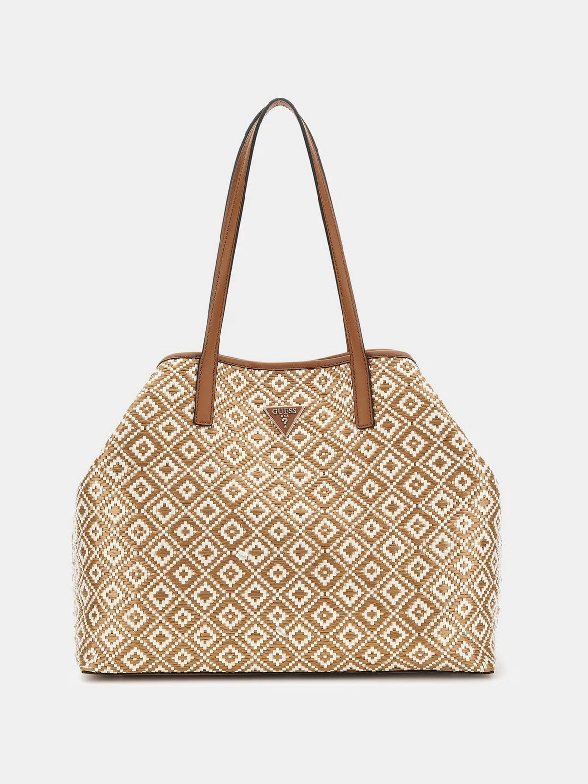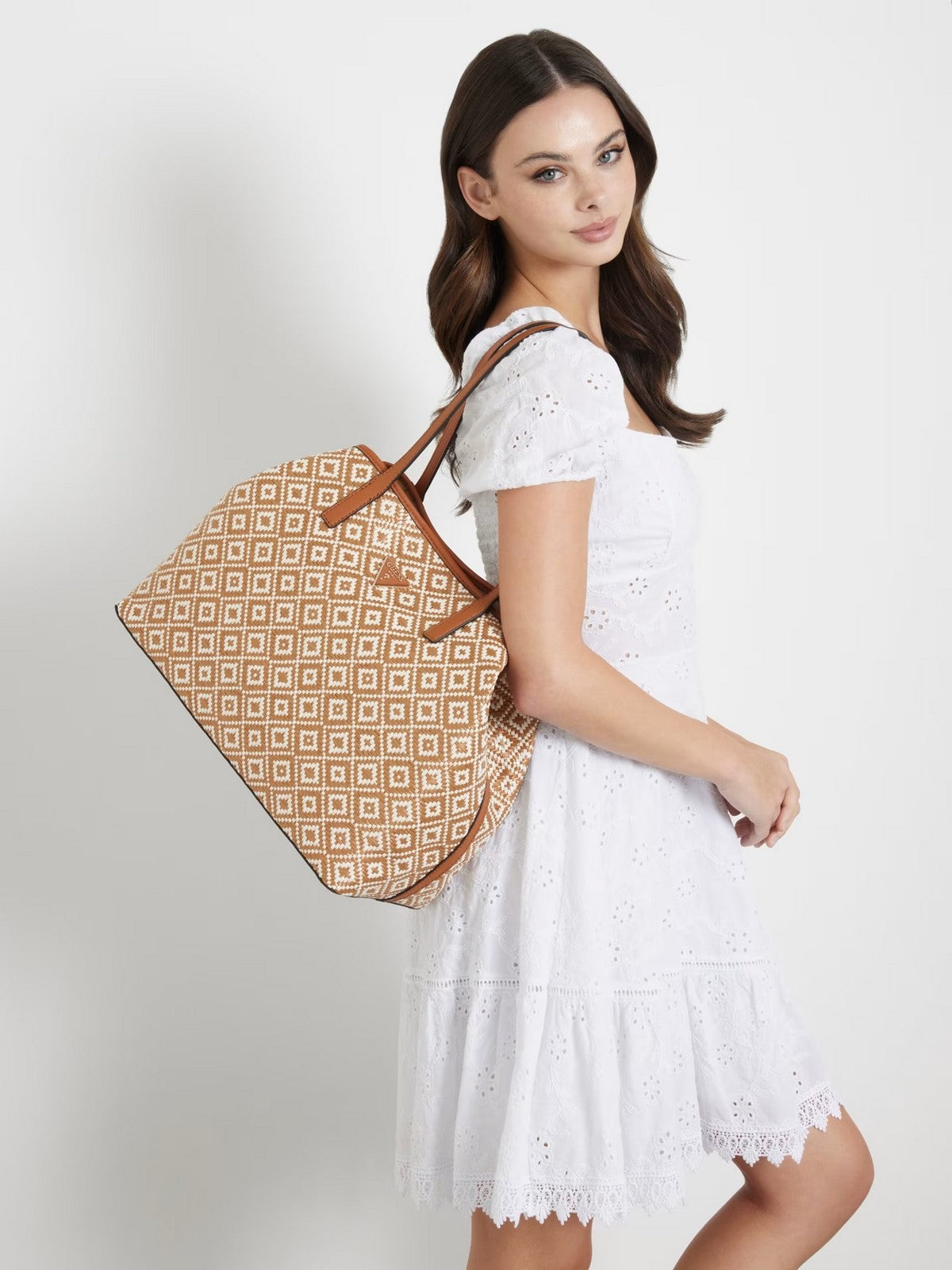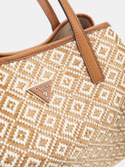 Borsa GUESS realizzata in rafia con Inserti in simil pelle. Lavorazione geometrica. Triangolo logo in metallo frontale. Chiusura con bottone.