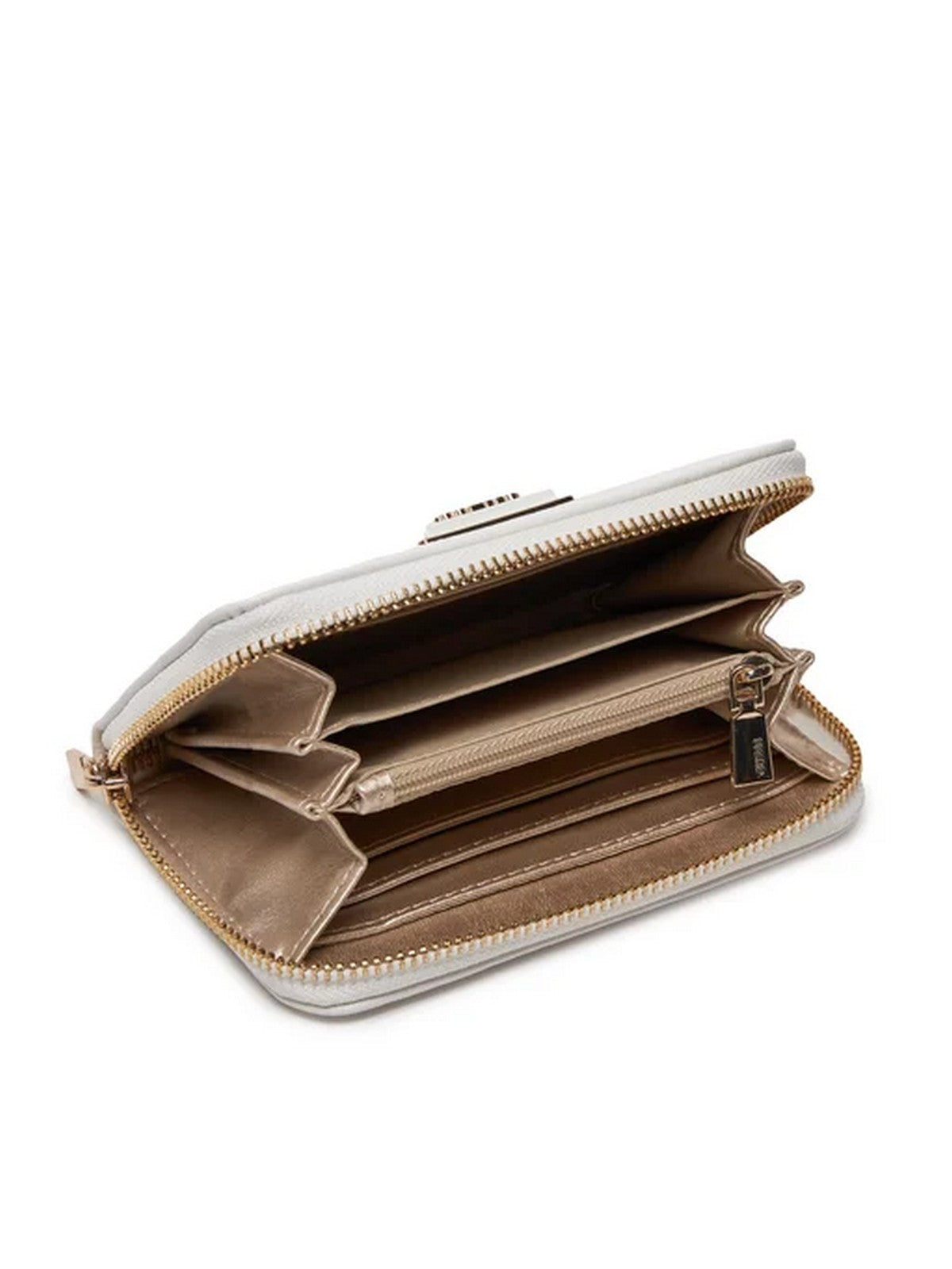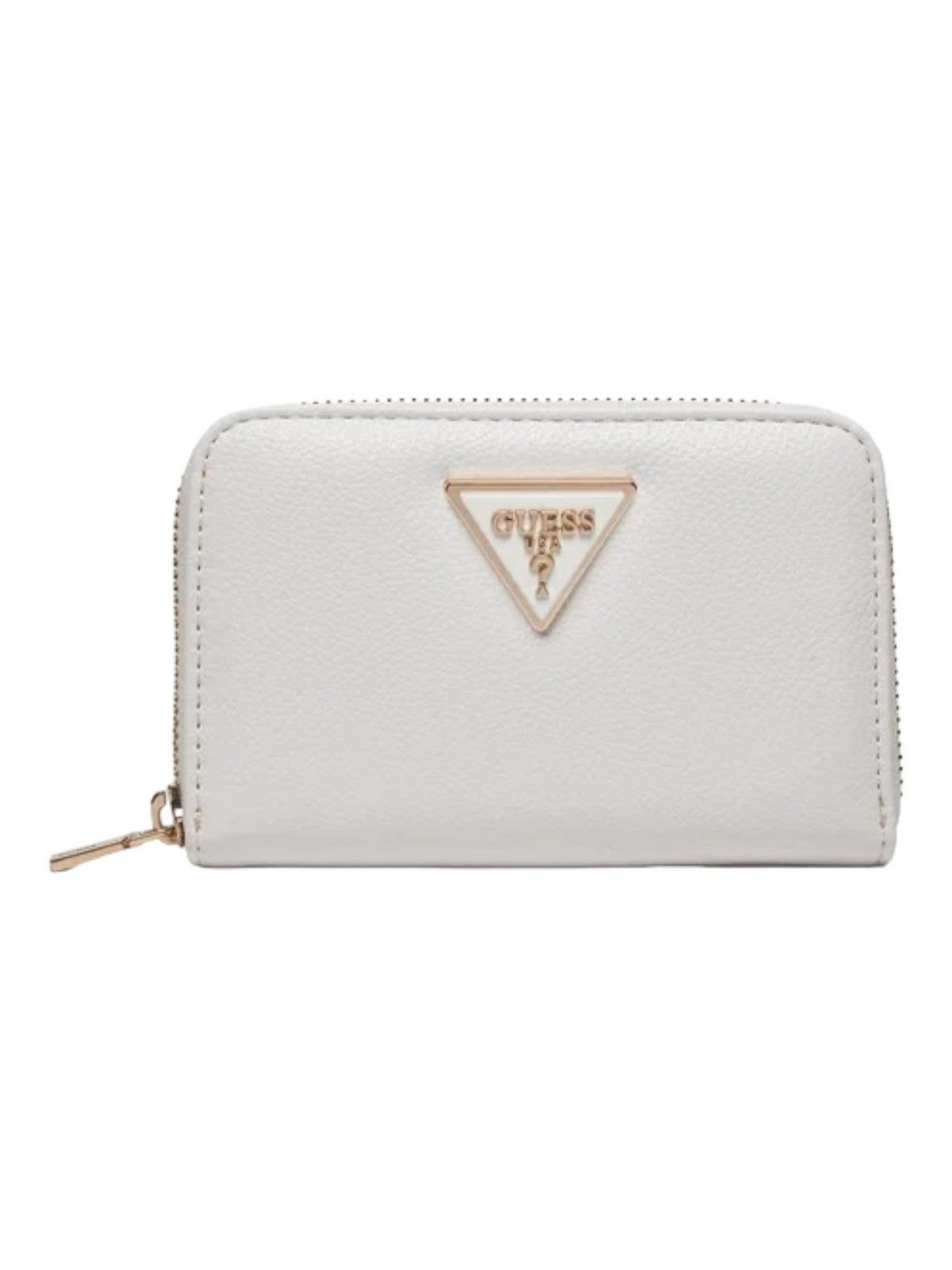 Portafoglio GUESS in similpelle. Triangolo logo in metallo frontale. Chiusura con zip. All'interno scomparti per carte business, banconote e documenti. Scomparto con zip per monete.