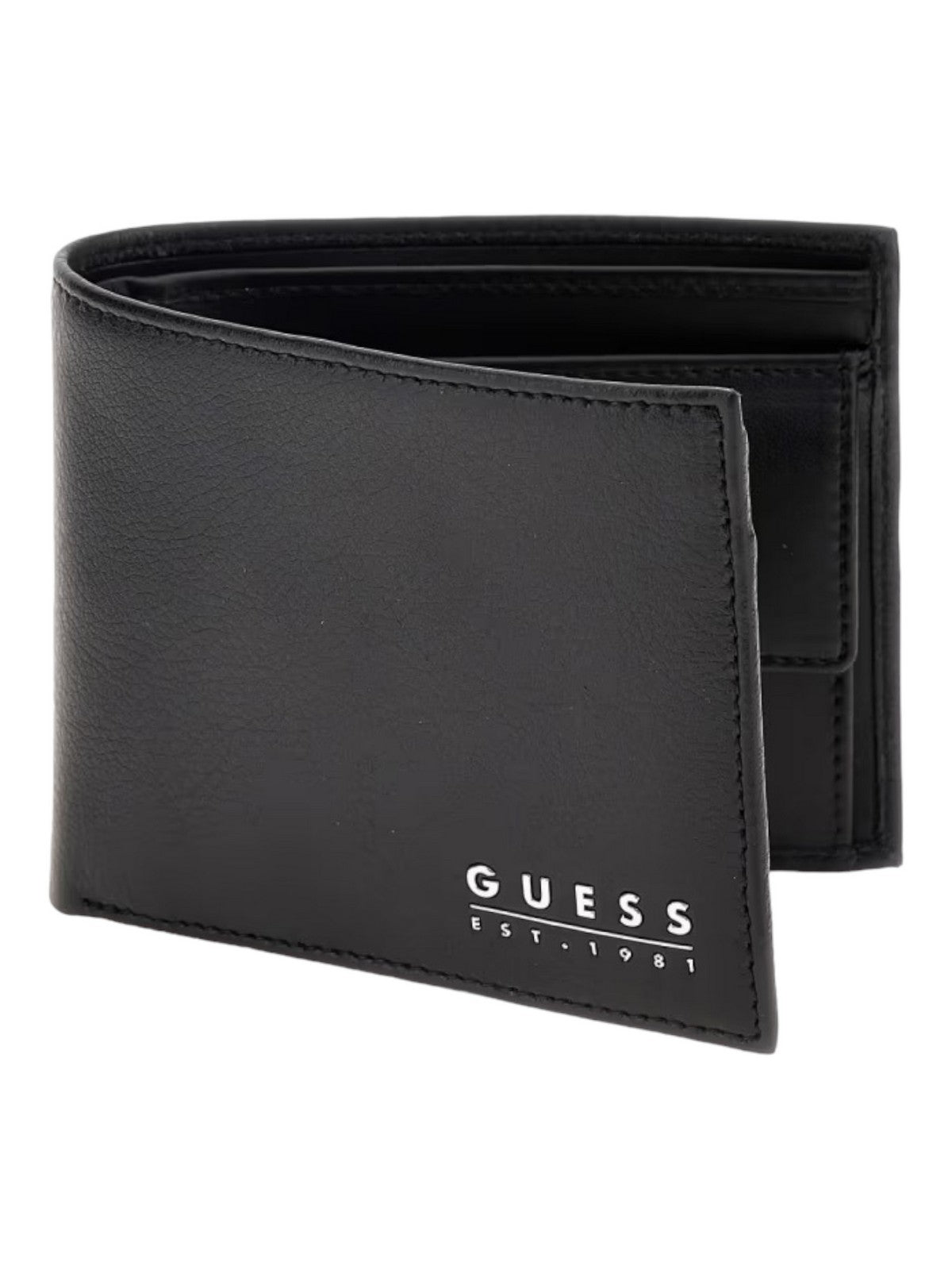 Portafoglio uomo GUESS in pelle. Scritta logo a contrasto. All'interno scomparto per carte business, documenti e banconote. Scomparto per monete con chiusura.