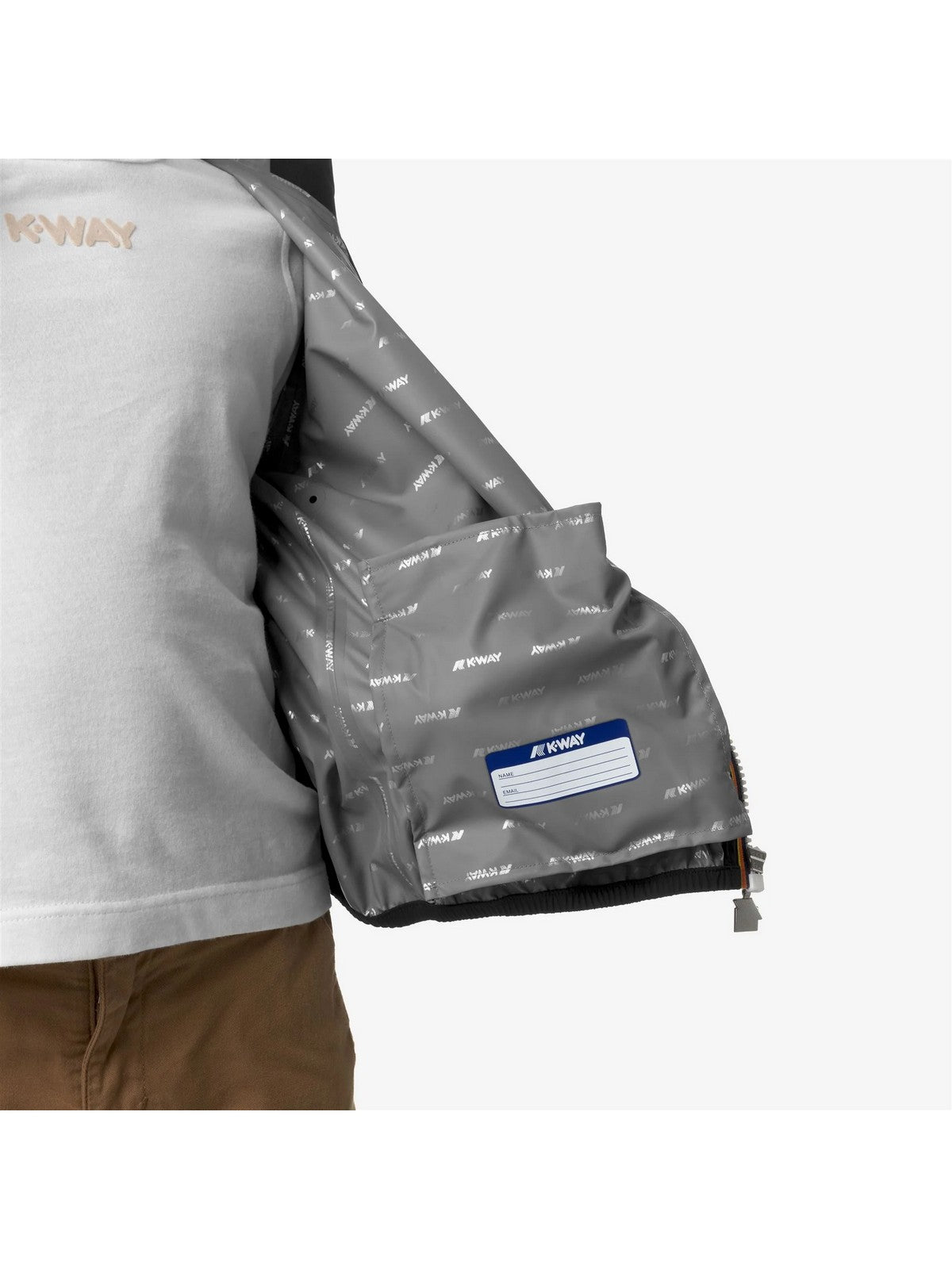 Giubbino K-WAY Jack realizzata in tessuto tecnico elasticizzato che segue i movimenti e protegge dal vento e dalla pioggia fino a 10000 colonne d'acqua. L'interno è foderato con una membrana isolante decorata con lettering K-Way stampato all over in tonalità argento.