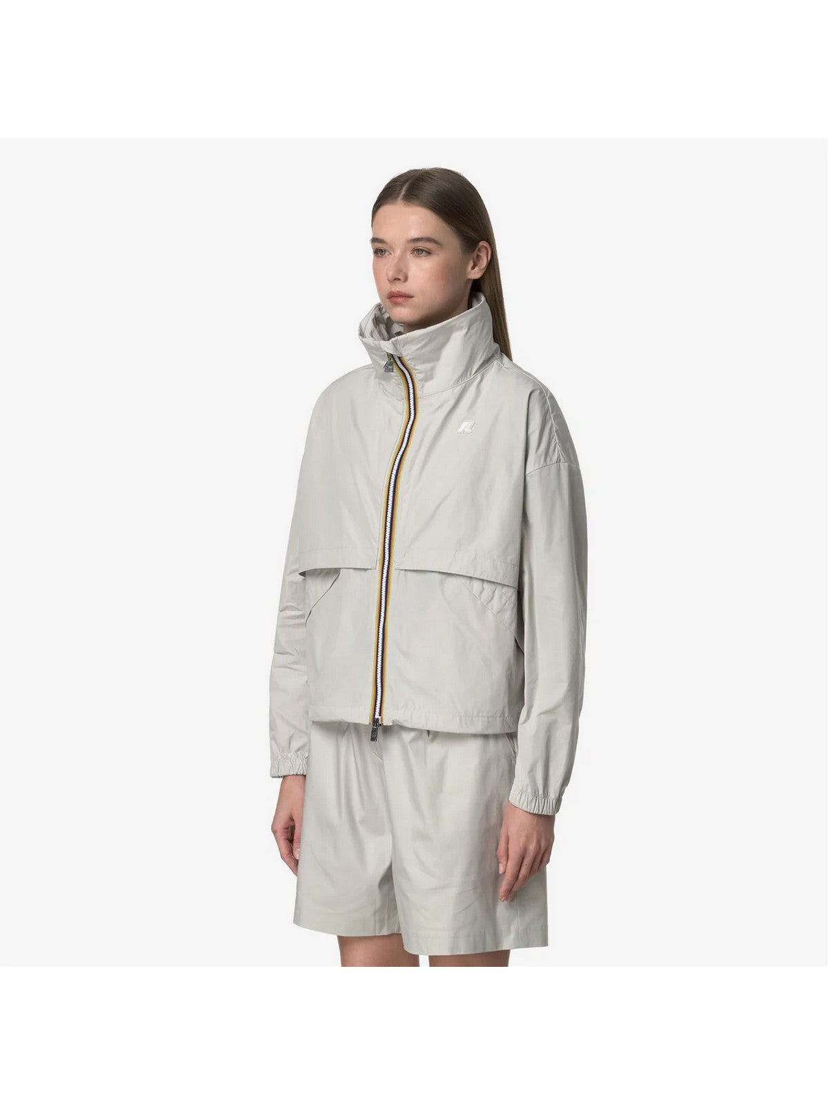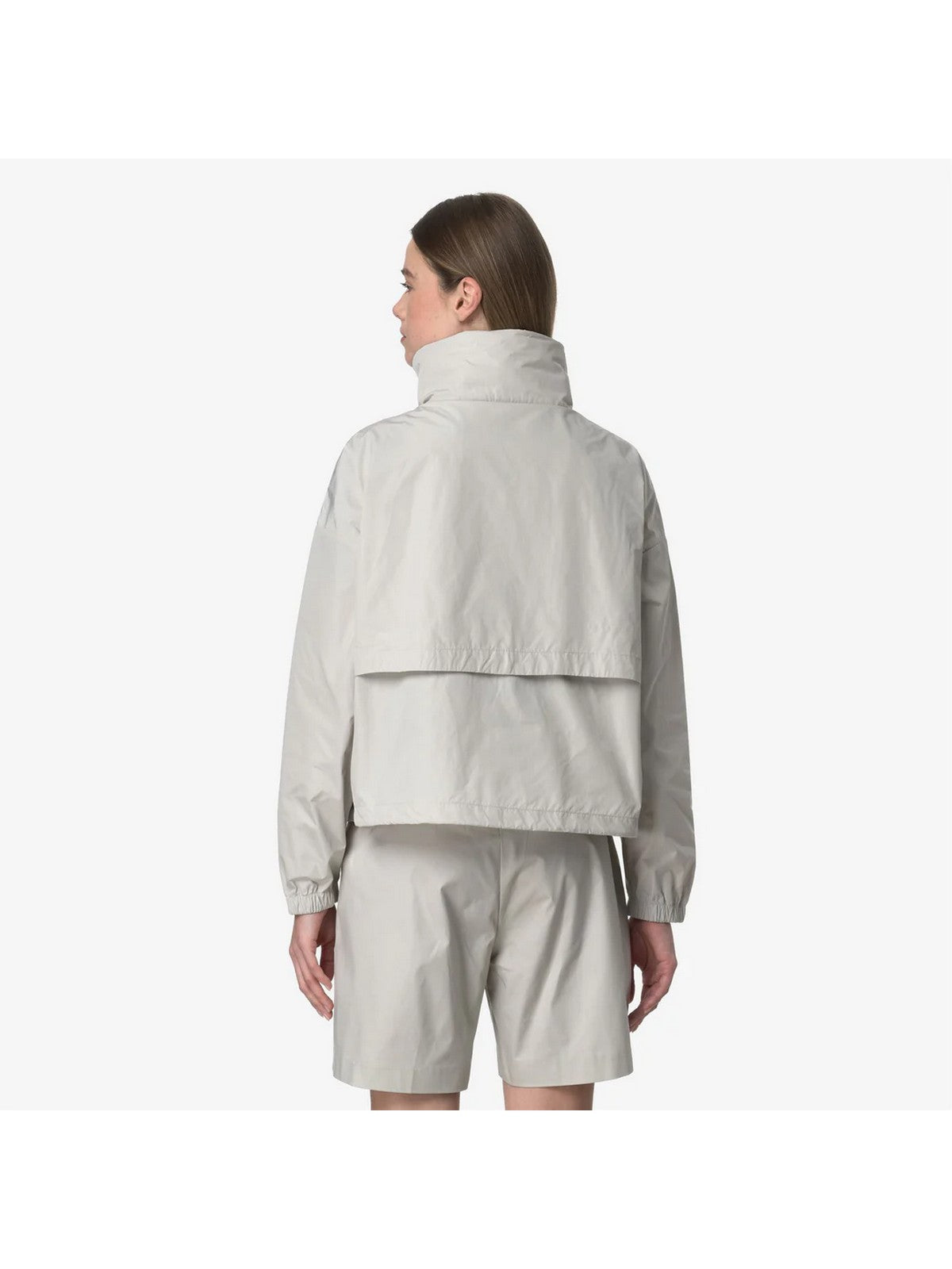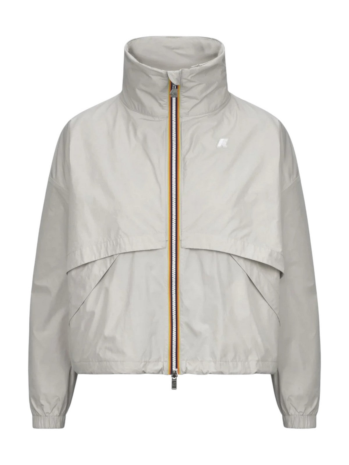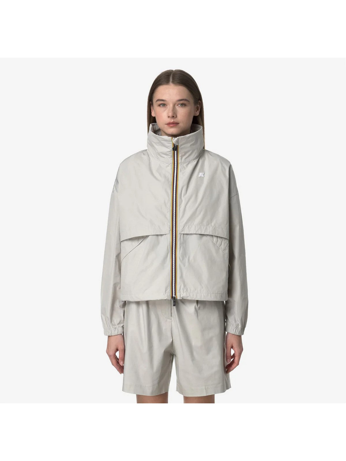 Giubbino donna K-WAY Aubette tessuto dalla finitura liscia e gommata e al taglio crop con dettagli voluminosi come maxi tasche e maxi flap sul fronte. La giacca presenta chiusura con zip nei colori K-Way, collo alto, polsi elastici e vita regolabile con coulisse.