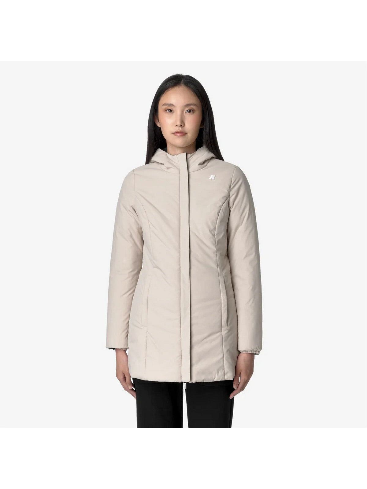 Giubbino K-WAY reversibile, un lato in poliestere elasticizzato impermeabile tinta unita e un lato in poliestere antivento dal colore a contrasto.