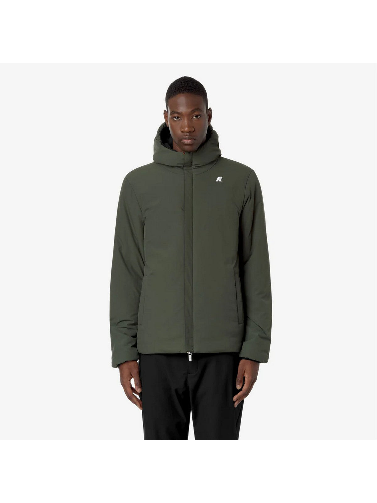 Giubbino K-WAY reversibile un lato in poliestere elasticizzato impermeabile e un lato in poliestere antivento dal colore a contrasto.
