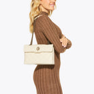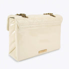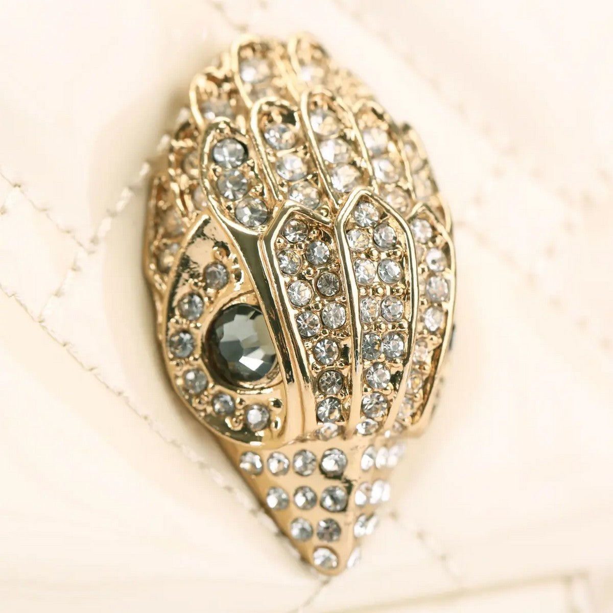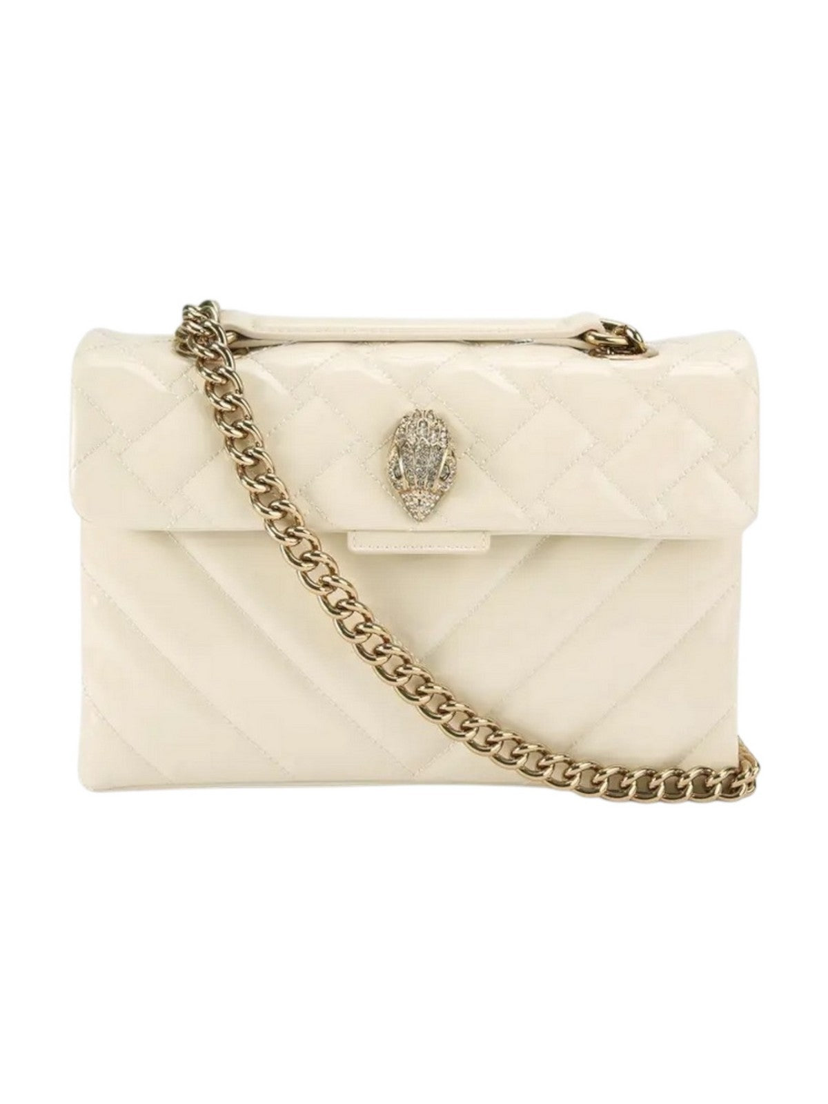 Borsa Kensington KURT GEIGER realizzata in vernice color crema con motivo trapuntato a impunture. La testa d'aquila dorata è impreziosita da cristalli e occhi di perline nere sulla patta frontale.