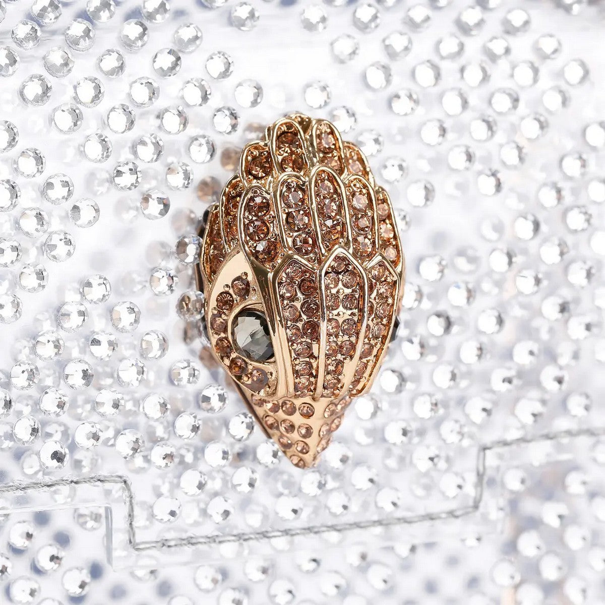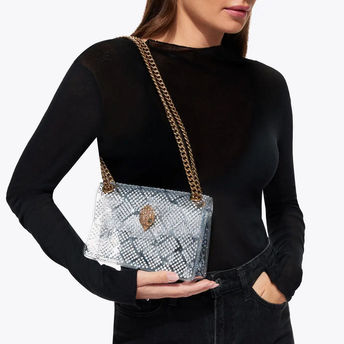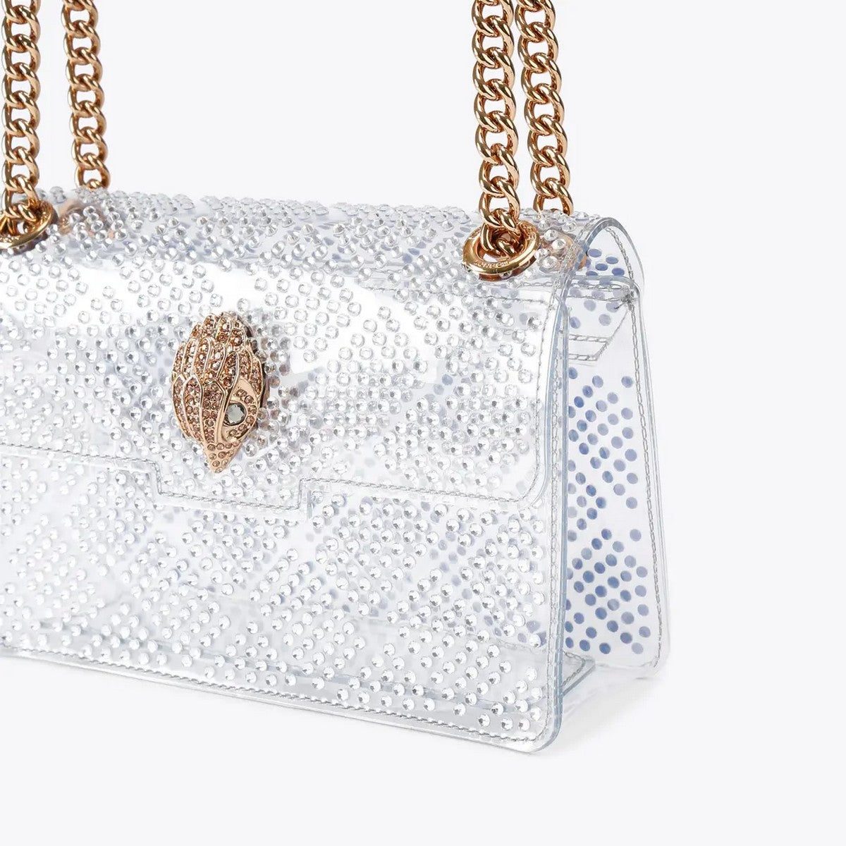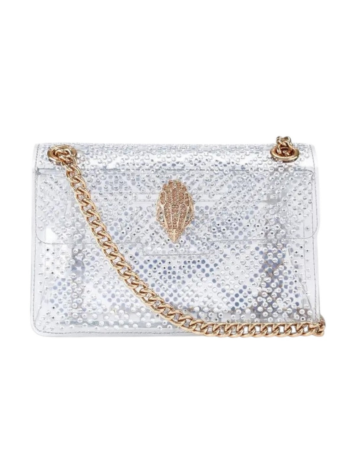 Vinyl Mini Kensington KURT GEIGER realizzata in vinile trasparente impreziosito da cristalli argentati. La testa d'aquila in cristallo dorato è posta sulla patta anteriore.